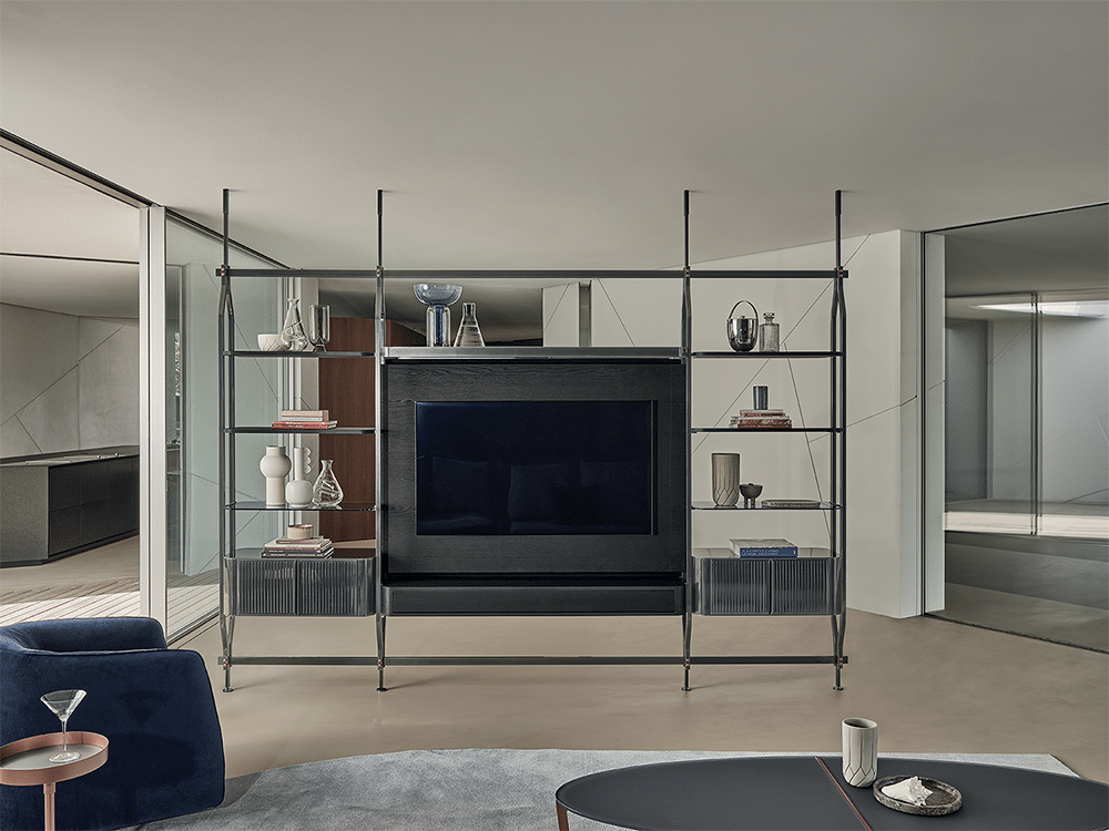 Con la sua capacità di integrare libreria, zona TV e vani contenitivi, una parete attrezzata realizzata con gli elementi della libreria Charlotte Bontempi si adatta con flessibilità alle esigenze mutevoli della vita moderna. La sua presenza può essere imponente ma calibrata, così da offrire un palcoscenico ideale per l’espressione del gusto personale, dove oggetti d’arte, libri da collezione e tecnologia convivono in un equilibrio studiato.