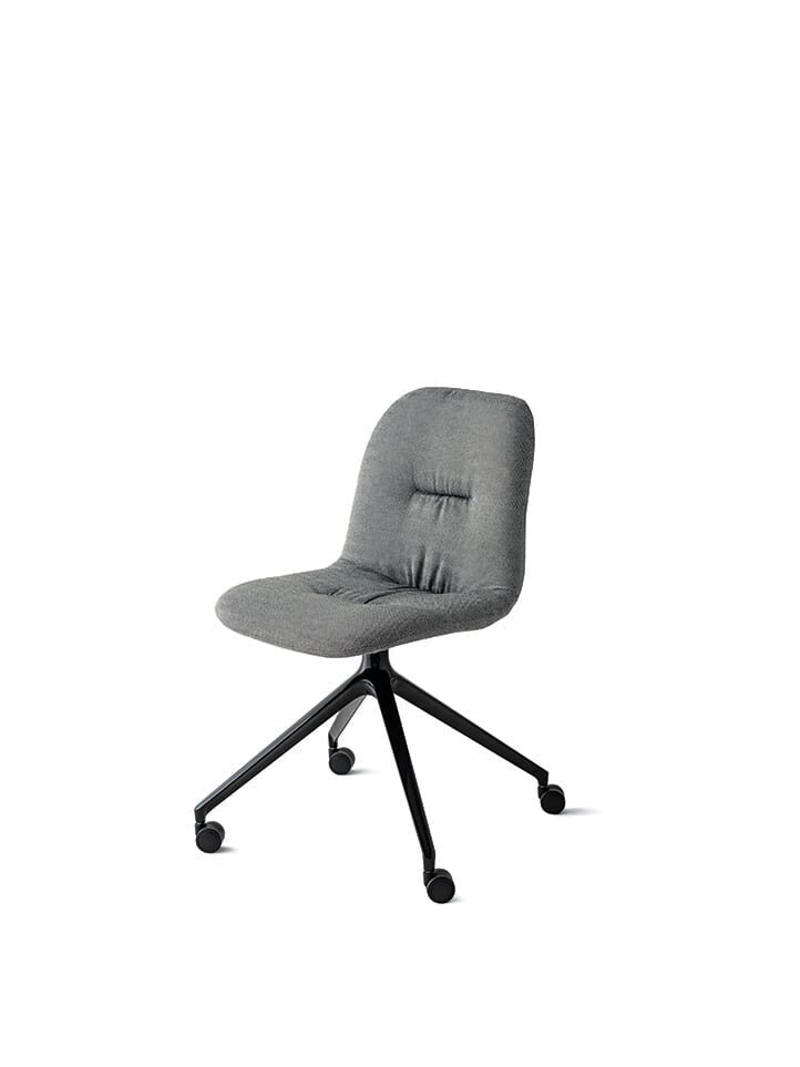 Sedia con struttura in Legno massello e struttura in acciao in tondino di acciaio. Gambe a sezione conica, girevole con e senza ruote in alluminio laccato.
