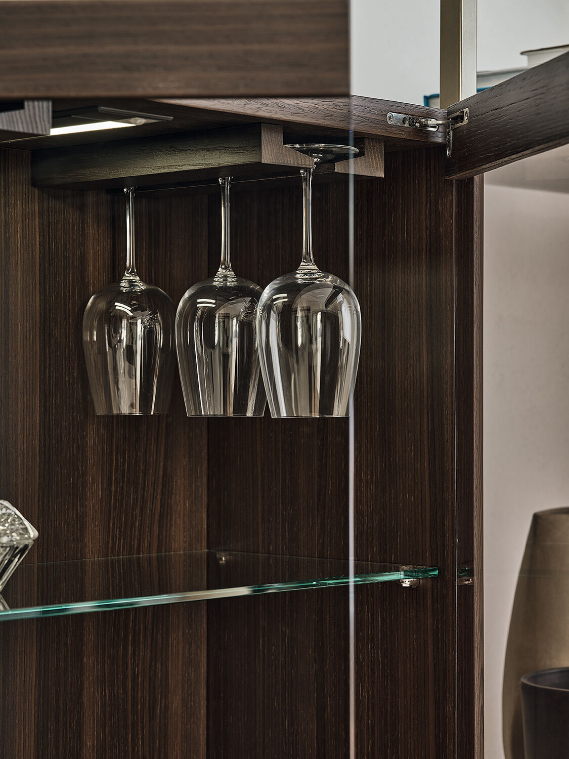 Libreria con fissaggio a parete e a soffitto predisposta per l'inserimento di max 4/8/12/16/20 ripiani e/o contenitori optional. Struttura, traverse e dettagli decorativi in Acciaio laccato.