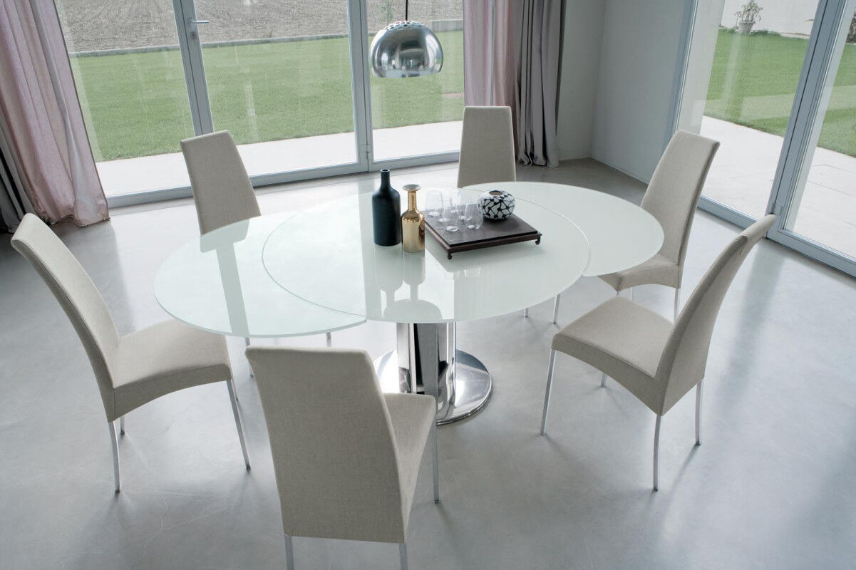 Tavolo di forma rotonda oppure ellittica in versione fissa o allungabile, con struttura in metallo laccato. Piano in legno laccato, impiallacciato, vetro lucido, vetro antigraffio opaco o Supermarmo. Il tavolo rotondo allungabile è l’elemento d’arredo che rivoluziona uno spazio minuto, grazie alla sua sagoma morbida e priva di spigoli. L’arma vincente è sceglierlo in una tonalità il più chiaro possibile perché, anche nel mondo dell’arredamento, i colori chiari ampliano, arieggiano e distendono. Da posizionare al centro della stanza principale per creare un allineamento armonioso nell’ambiente.