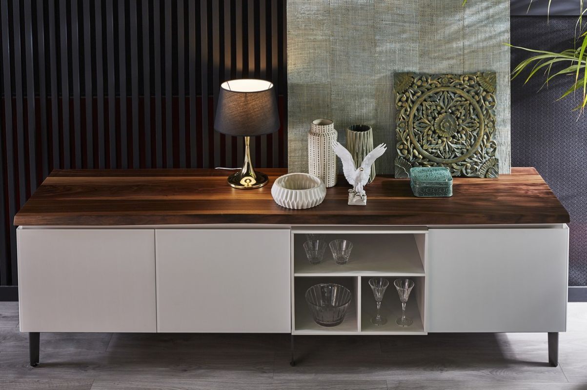 Gruppo madie con struttura in Legno, composte da ante, cassetti, vani a giorno, top, fianchi, frontali in Cristallo e Cristallo Antigraffio. Sistema di apertura con gola.