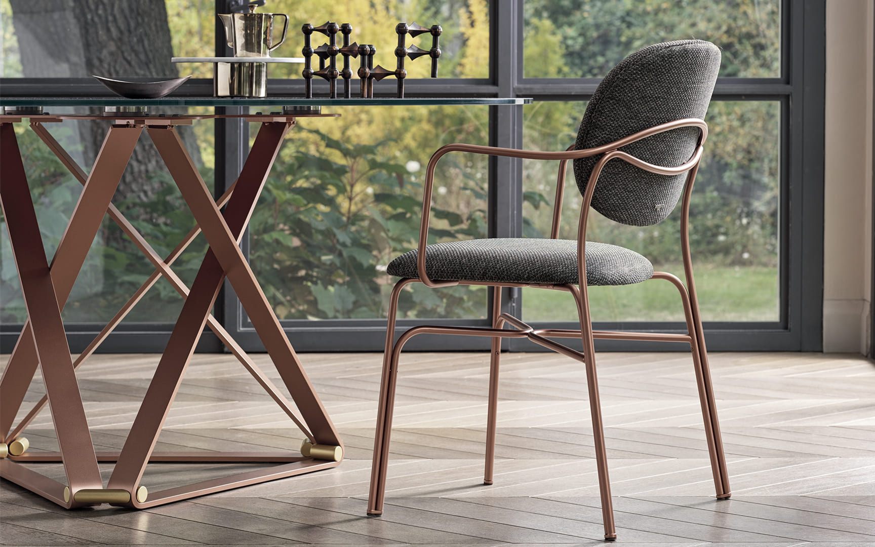Feststehender runder Tisch mit Gestell und dekorativen Details aus lackiertem Stahl. Platte aus Furnierholz, Kristall, kratzfestem Kristall und SuperMarmo.