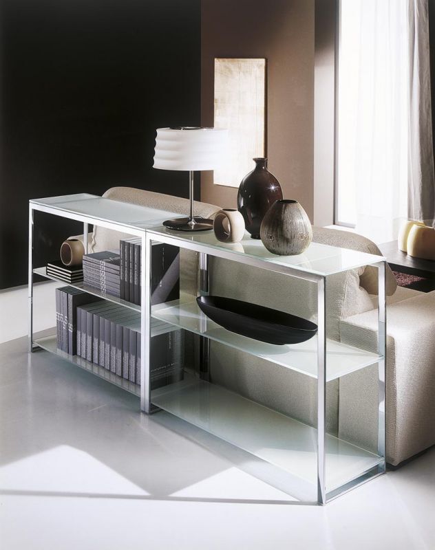 Couchtisch mit Stahlgestell und Tischplatte aus Kristall oder kratzfestem Kristall.