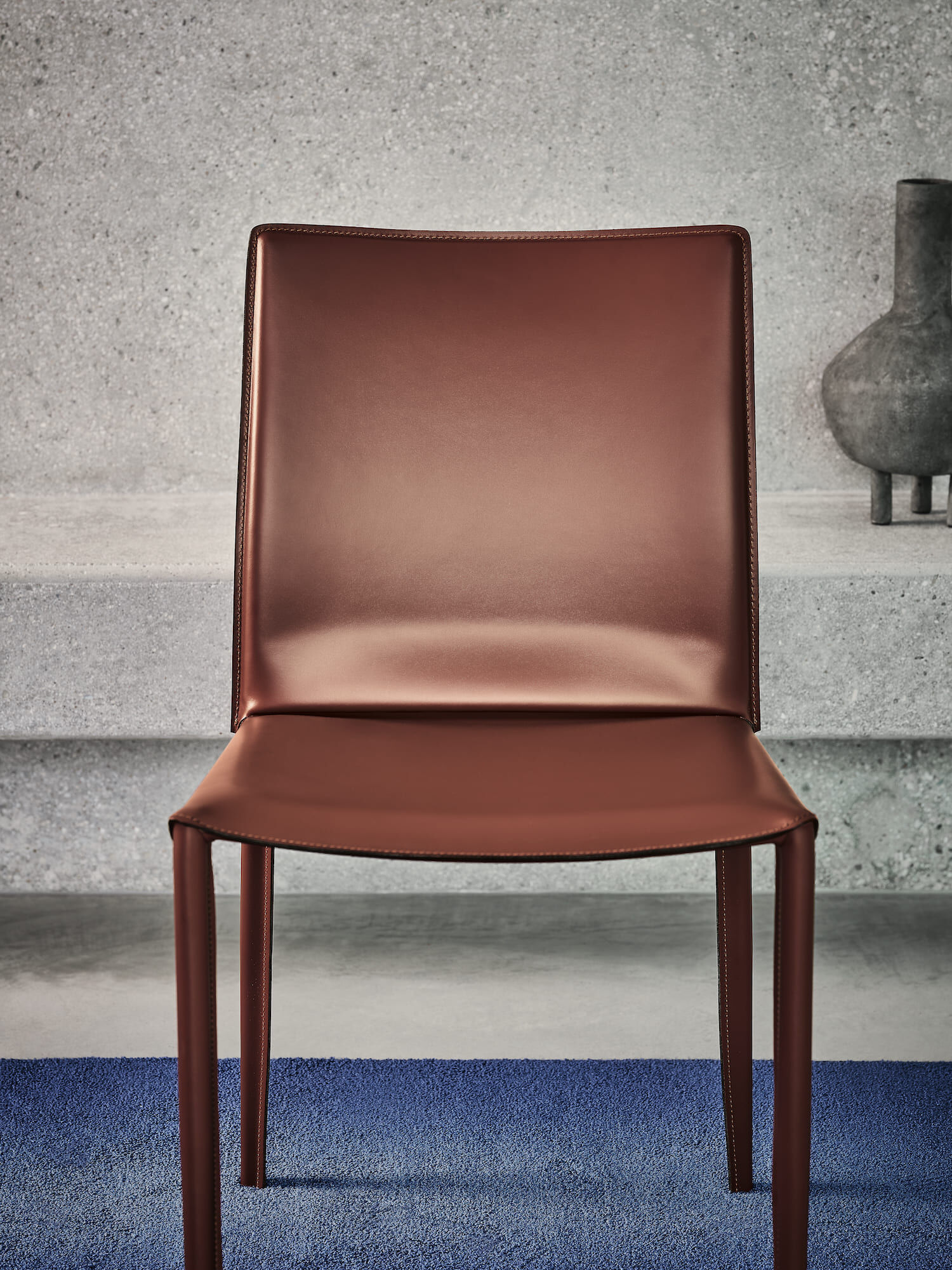 Stuhl mit und ohne Armlehnen mit komplett gepolstertem und bezogenem Stahlgestell.