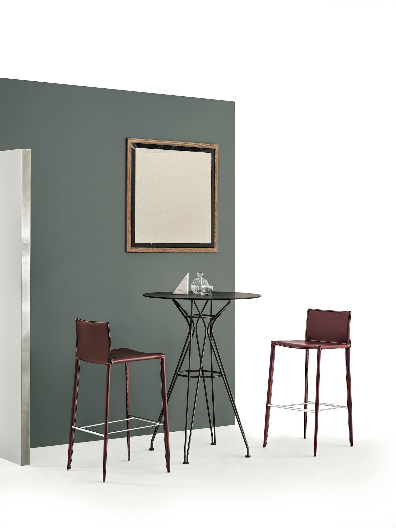 Hocker mit komplett gepolstertem und bezogenem Stahlgestell.