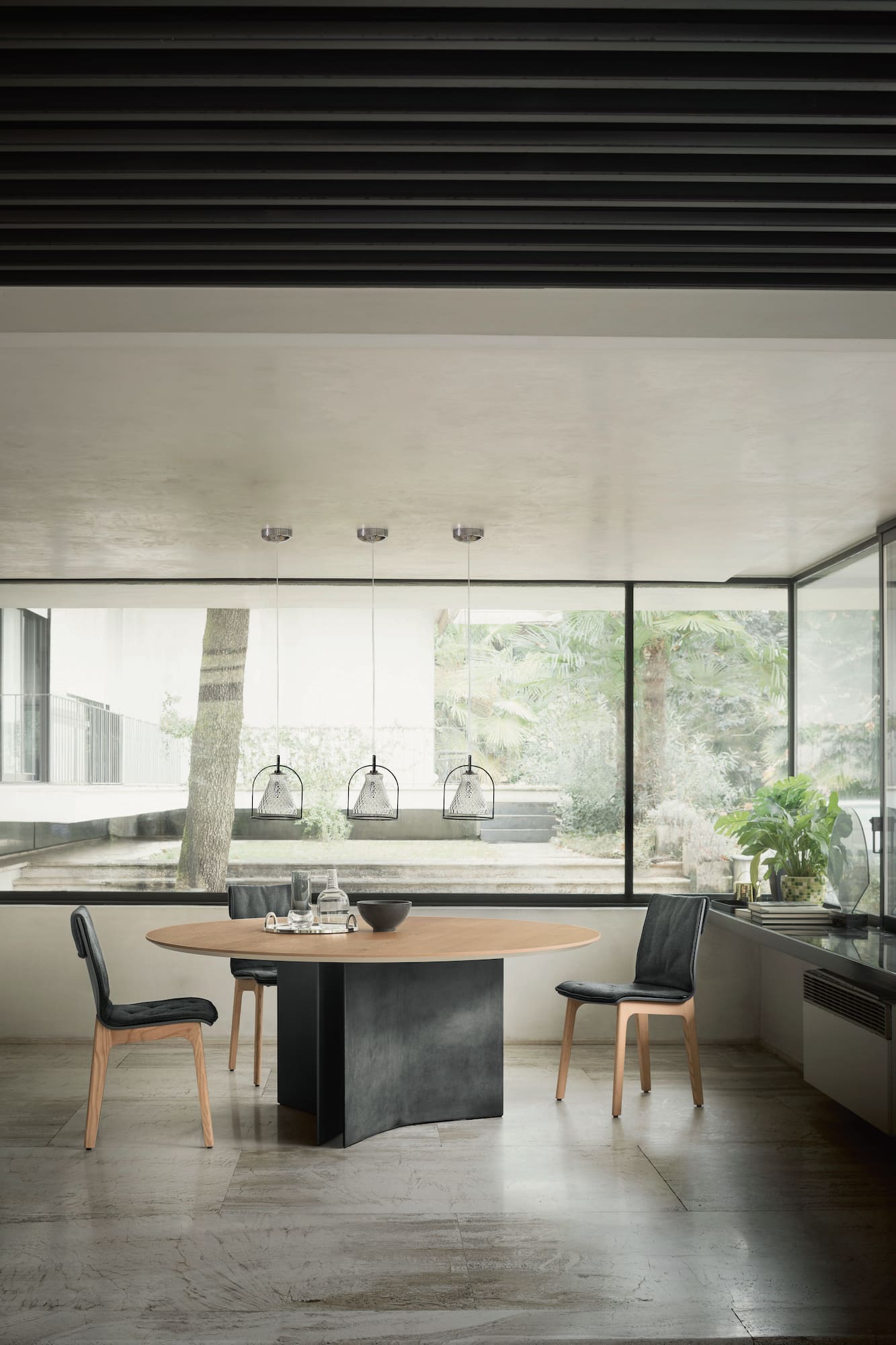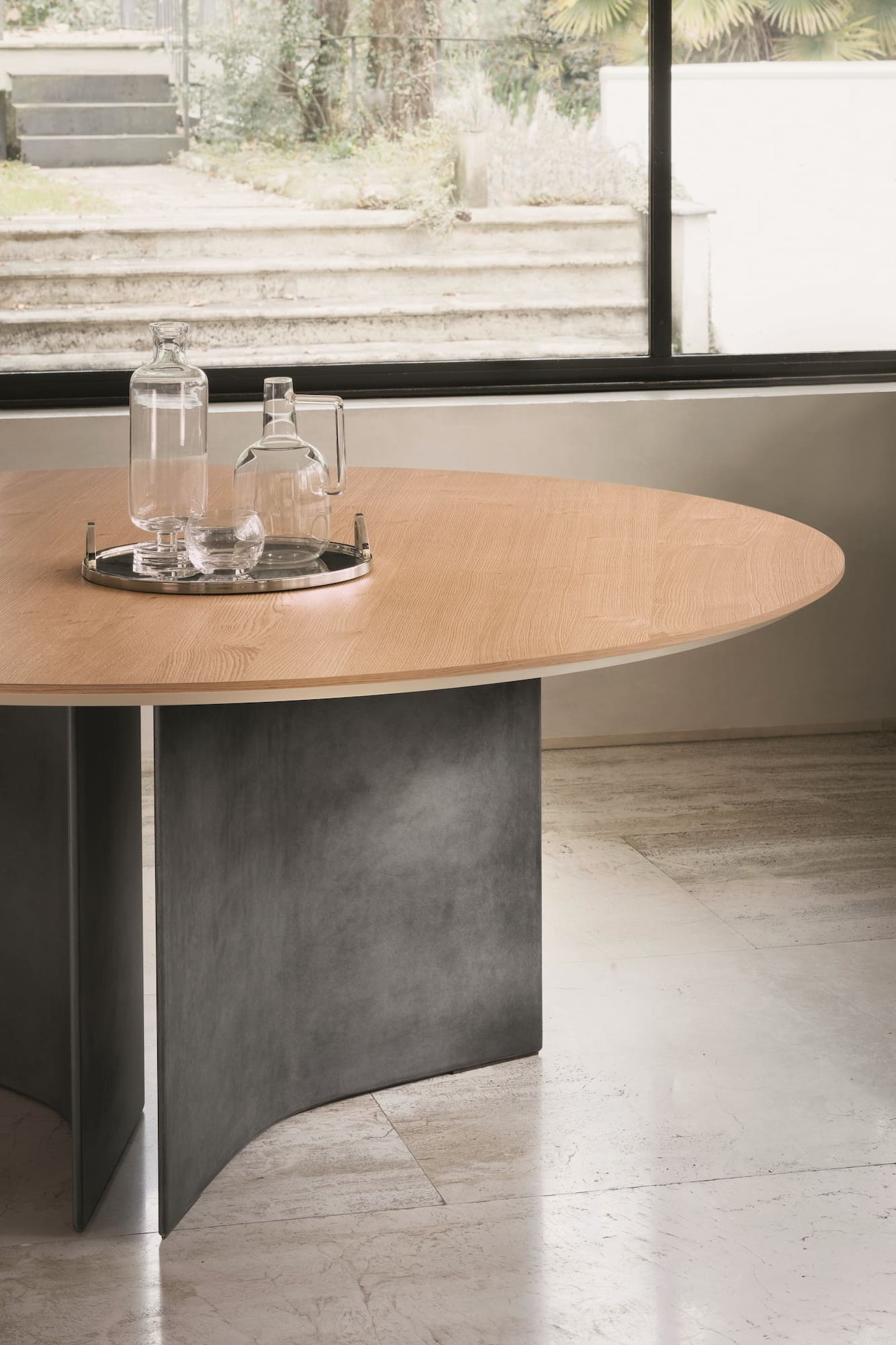 Feststehender und runder Tisch mit Zementfuß und Furnierholzplatte, glänzendem Kristall, mattem kratzfestem Kristall oder SuperMarmo.