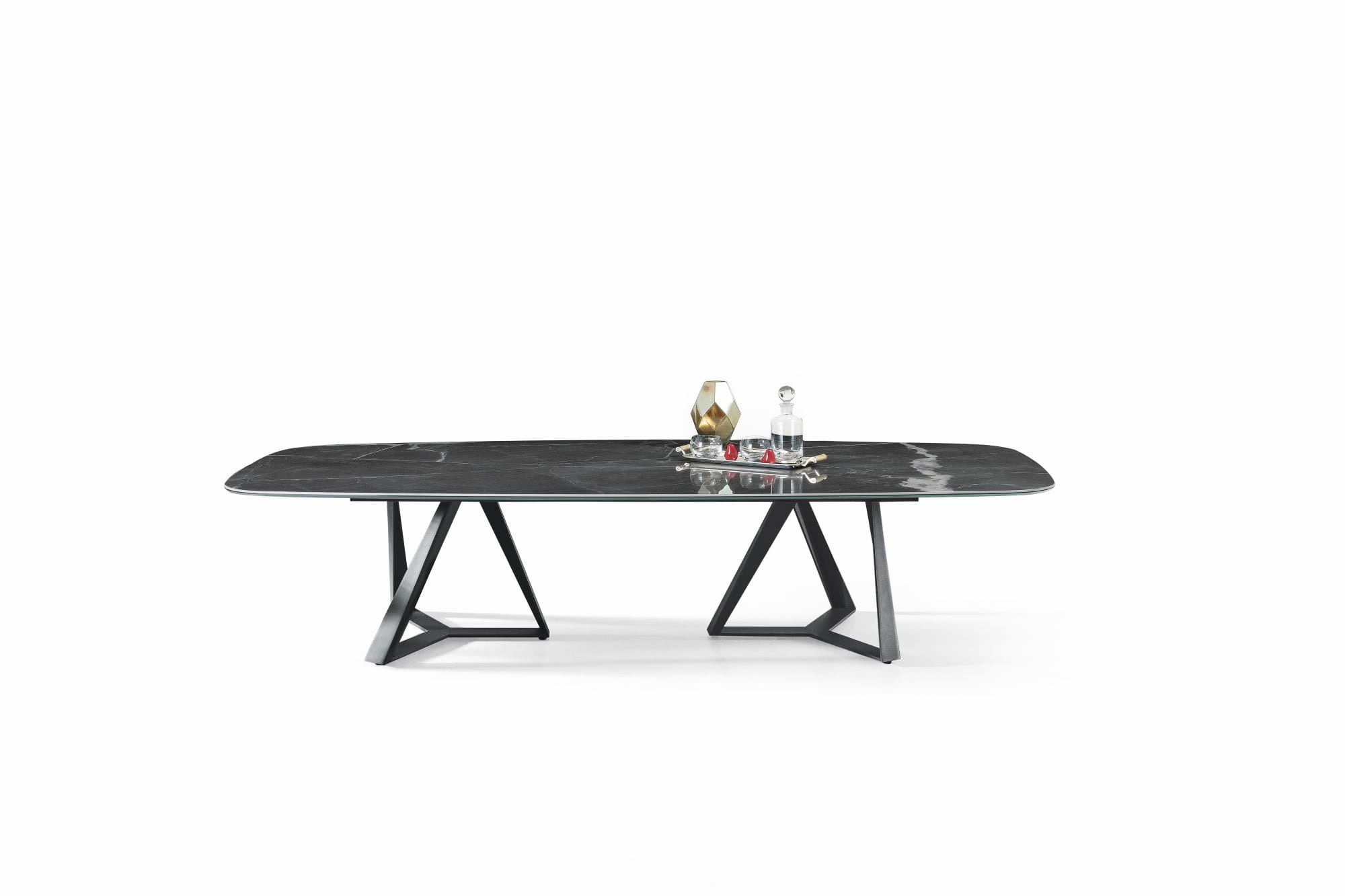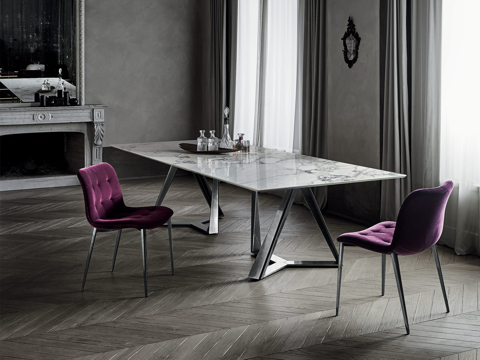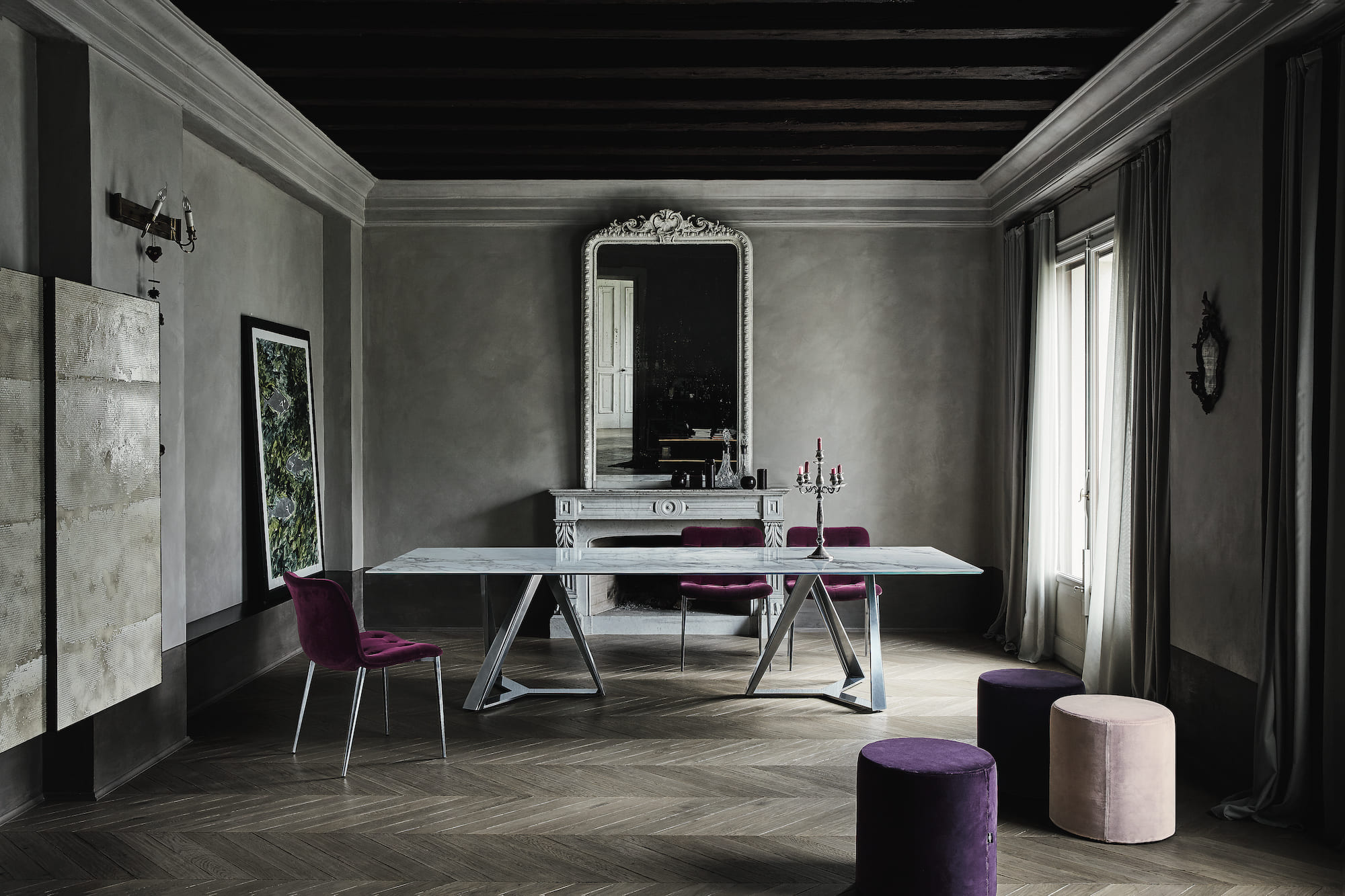 Feststehender Tisch mit lackiertem Aluminiumgestell. Furnierholzplatte, Massivholz, Massivholz, Jahrhunderte altes Massivholz, SuperMarmo Arabescato und Kristall.