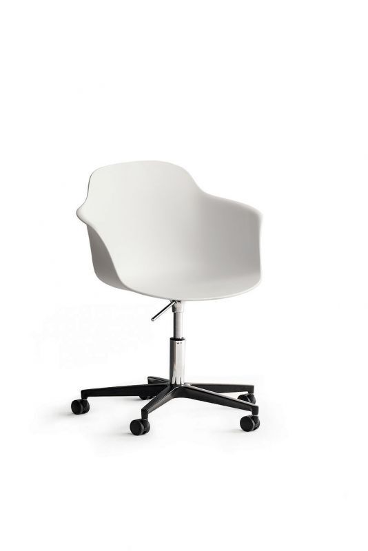 Stuhl mit und ohne Armlehnen, drehbar mit Rollen aus lackiertem Stahl oder Massivholz, Monocoque aus Polypropylen.