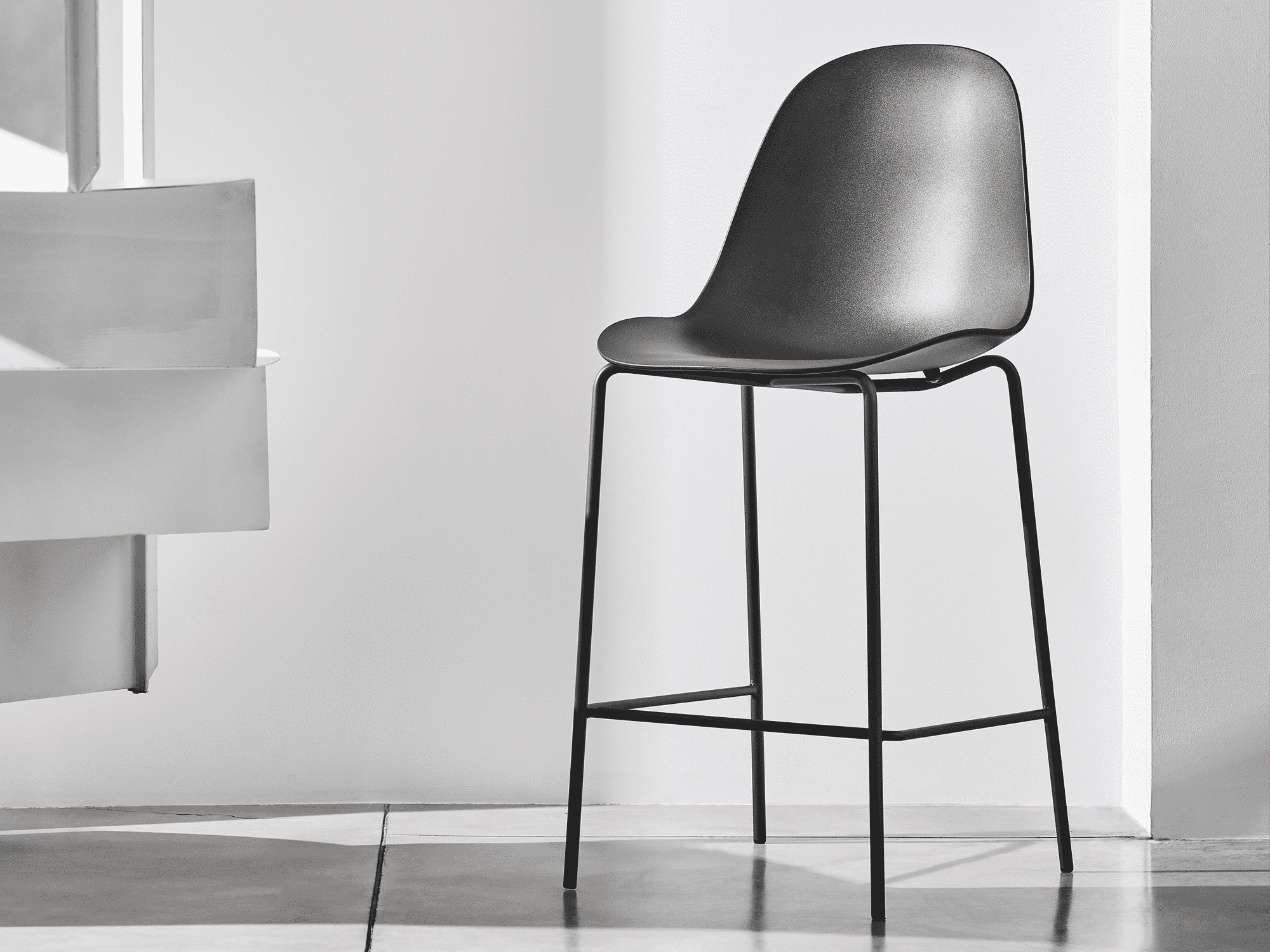 Hocker mit Gestell aus lackiertem Stahl für den Außenbereich, mit rundem und dreieckigem Querschnitt und Schale aus Polypropylen