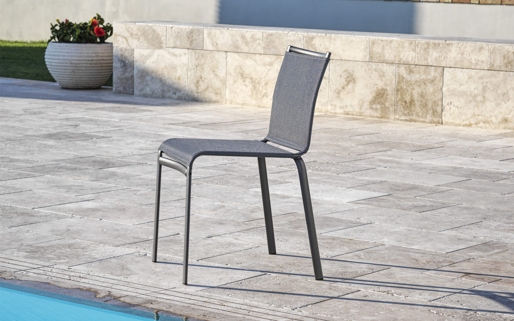 Stapelbarer Stuhl/Stuhl mit Armlehnen, Gestell aus lackiertem Stahl für den Außenbereich, Sitzfläche und Rückenlehnen aus Texplast oder Soft Texplast.