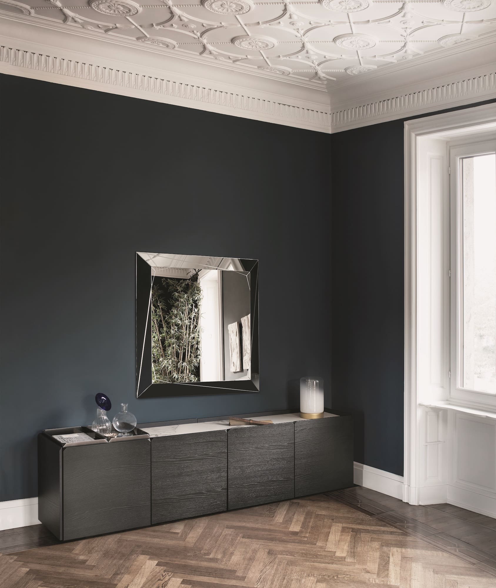 Sideboards mit Holzrahmen, Flügeltüren und offenen Fächern, Seiten und Türen aus Furnierholz. Arbeitsplatte nach Wahl. Mit Sockel oder Rahmen mit Stahlfüßen lackiert.