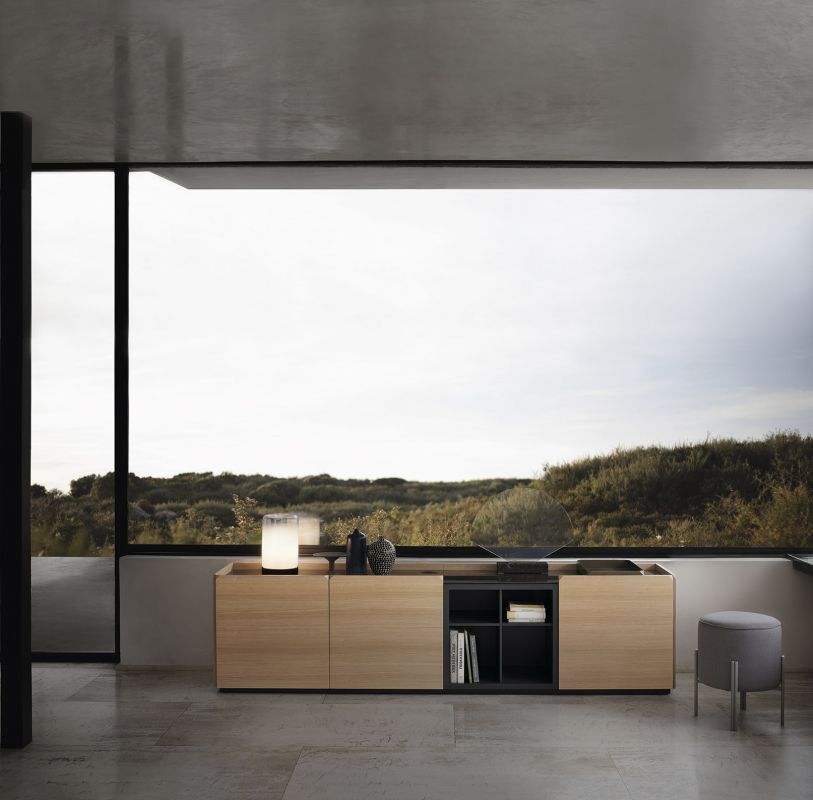Sideboards mit Holzrahmen, Flügeltüren und offenen Fächern, Seiten und Türen aus Furnierholz. Arbeitsplatte nach Wahl. Mit Sockel oder Rahmen mit Stahlfüßen lackiert.