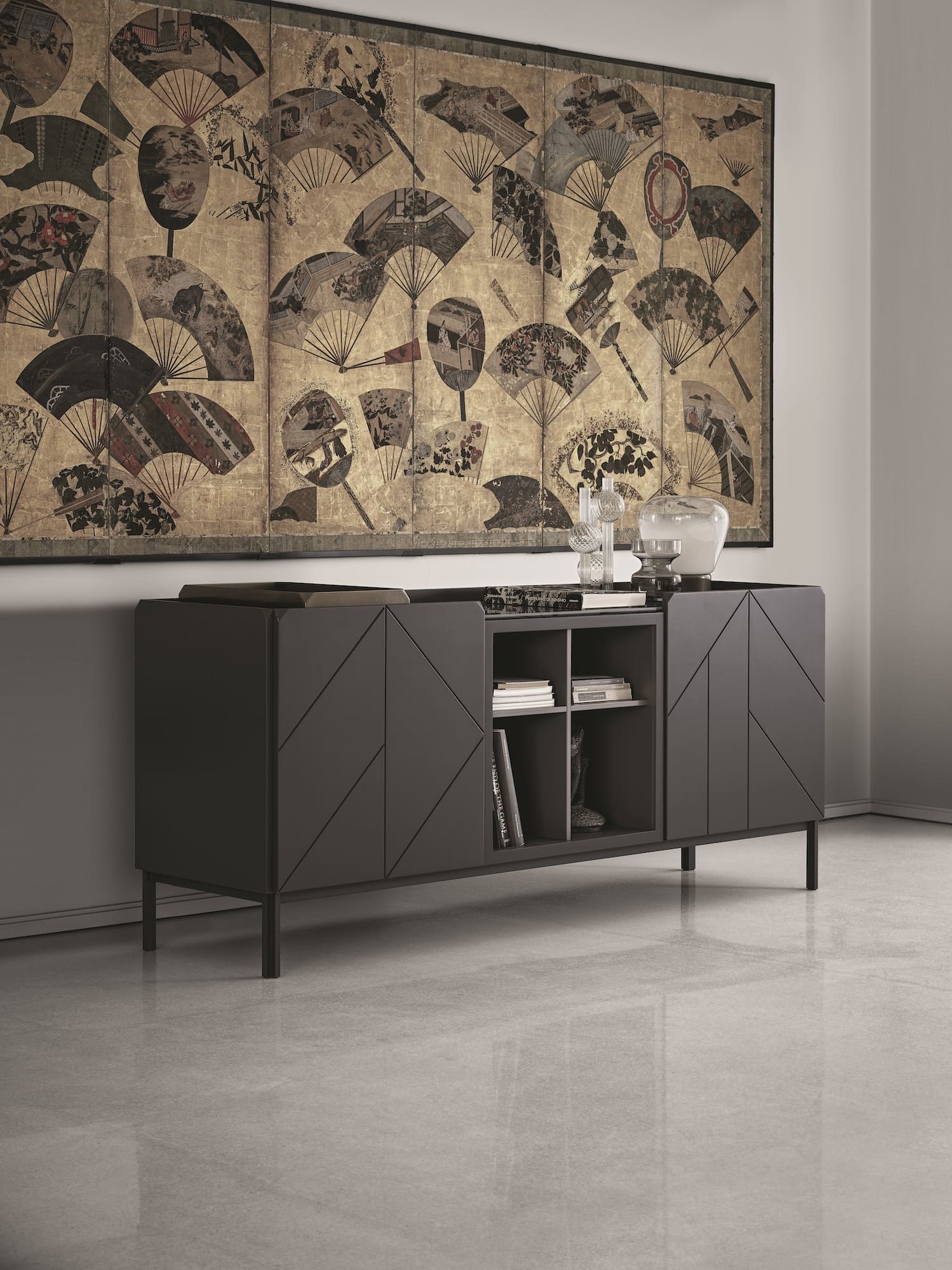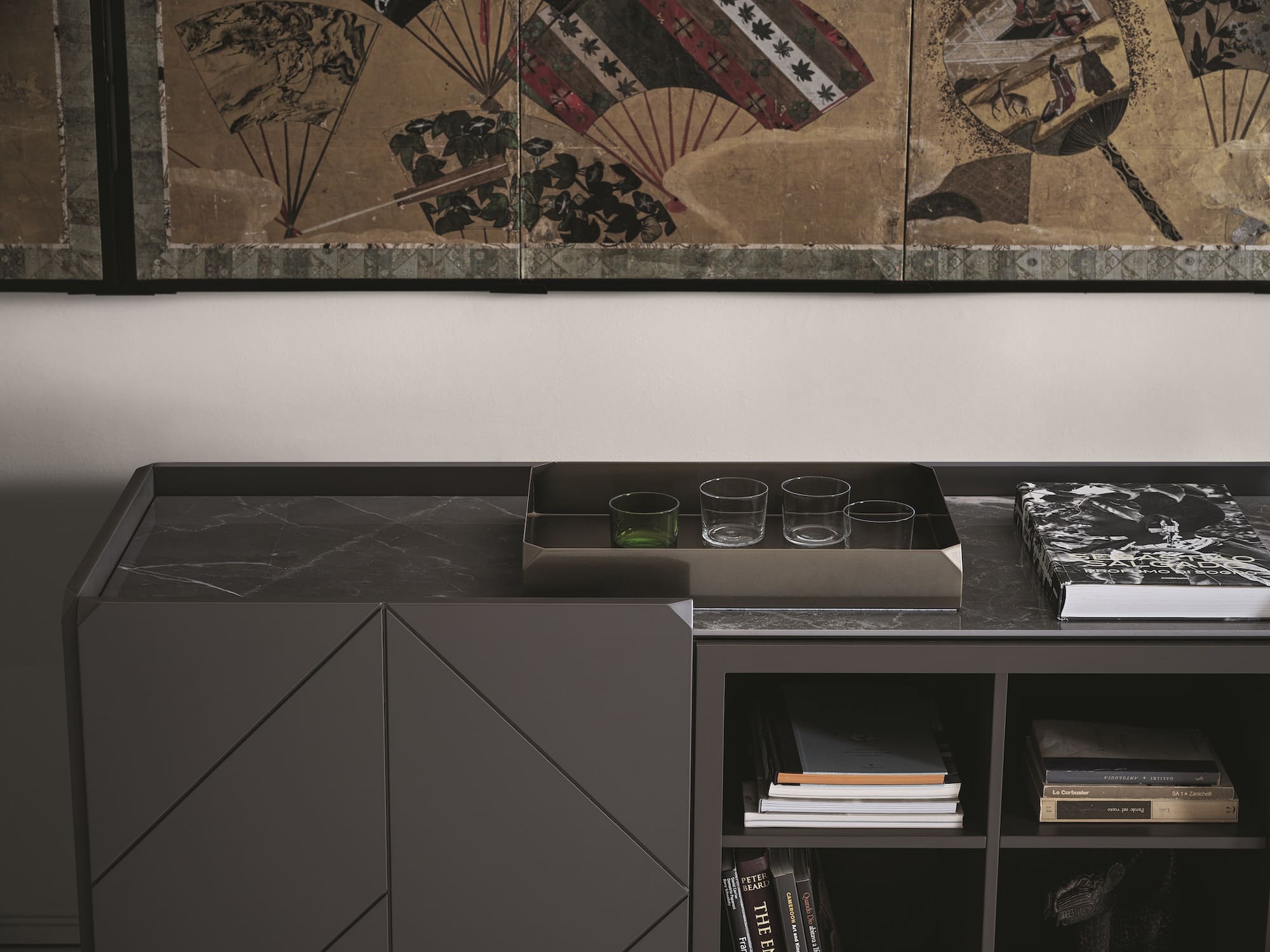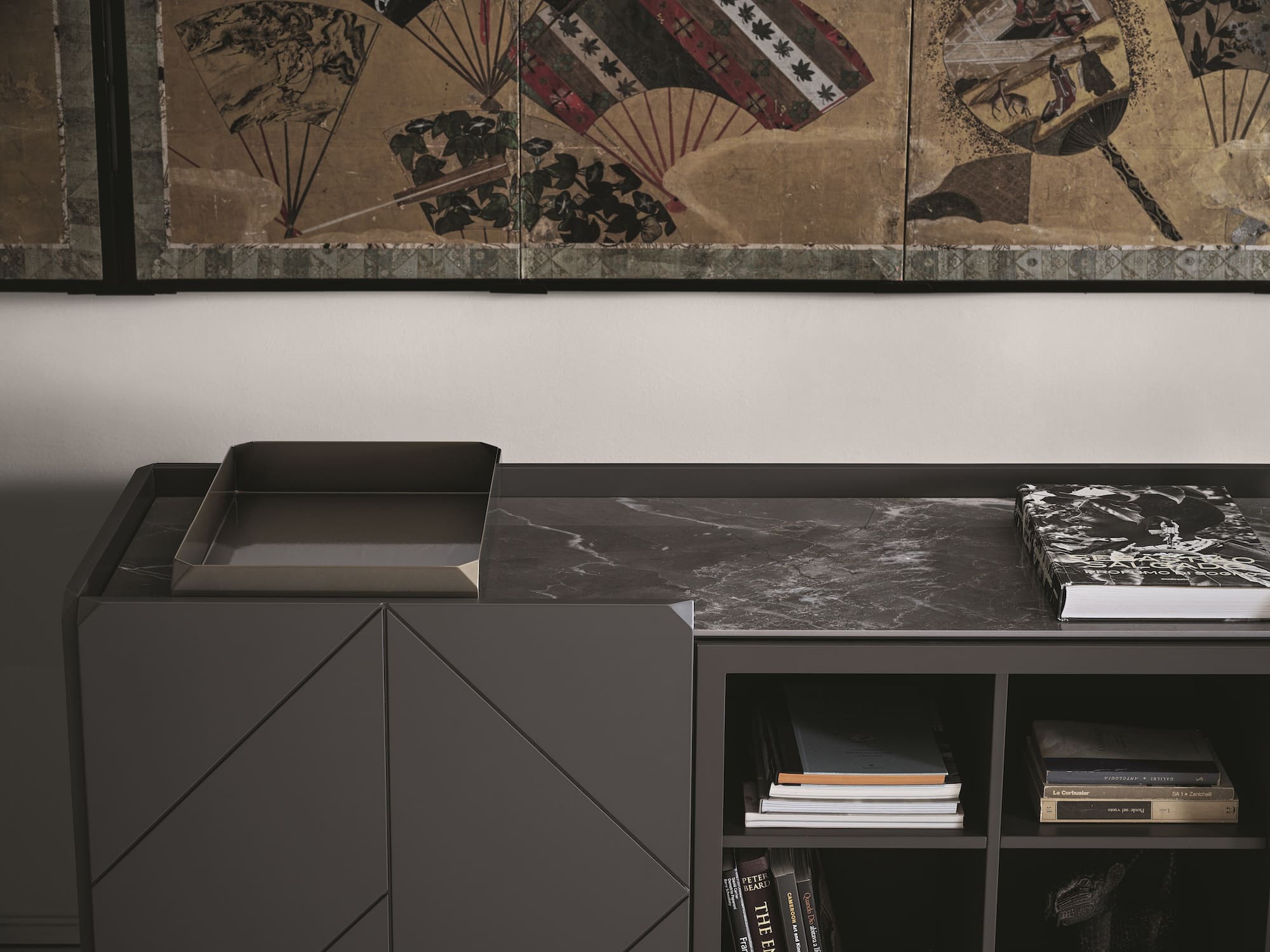 Sideboards mit Holzrahmen, Flügeltüren und offenen Fächern, Seiten und Türen aus Furnierholz. Arbeitsplatte nach Wahl. Mit Sockel oder Rahmen mit Stahlfüßen lackiert.