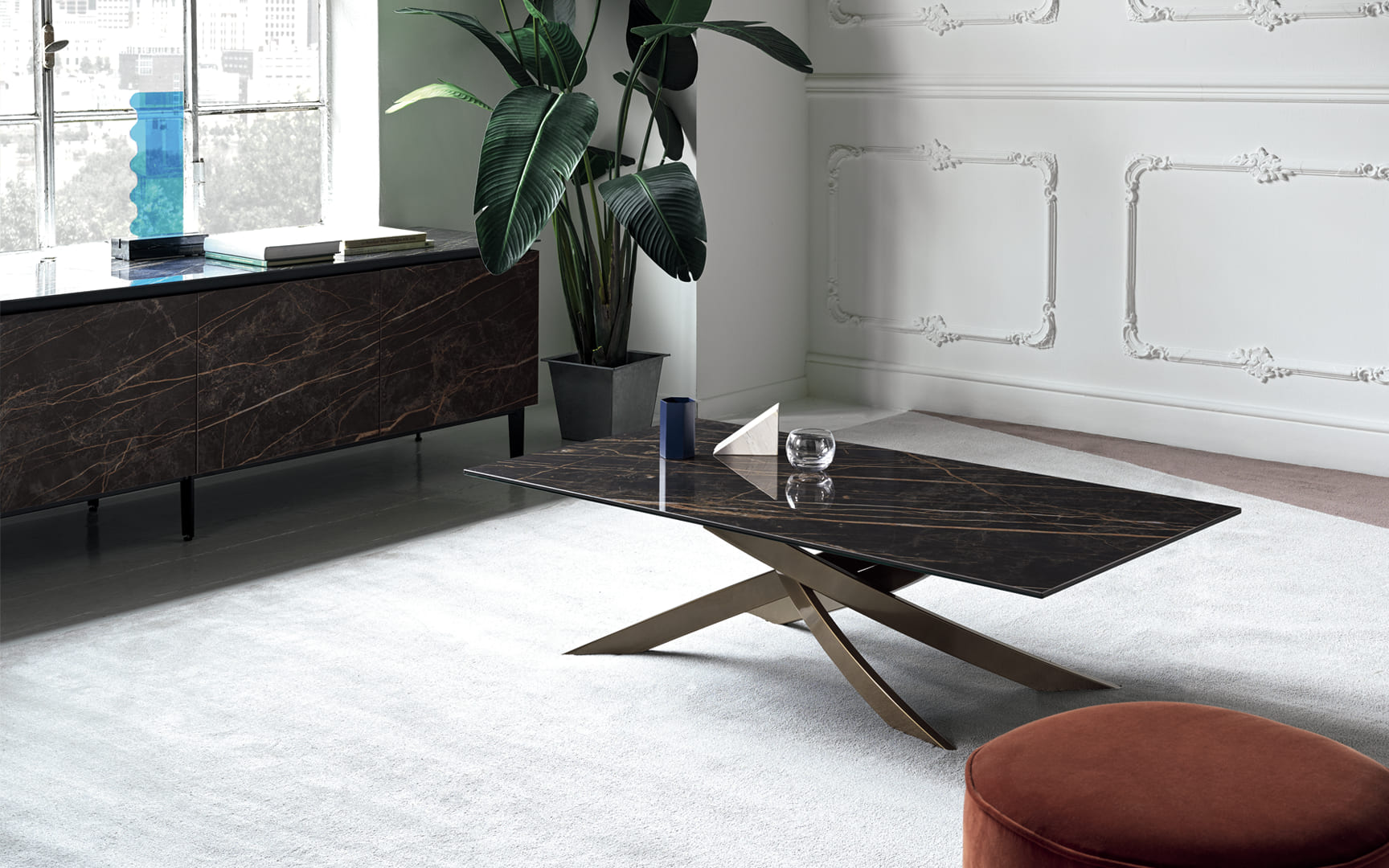 Coffee table with lacquered Metal frame, top in Veneer wood, Glossy glass, Velvet matt anti-scratch lacquered glass or SuperMarble.