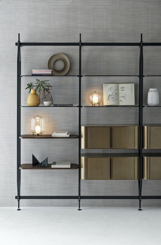 Bookcase with wall and ceiling fixing equipment designed for applying max 4/8/12/16/20 shelves and/or optional storages.
