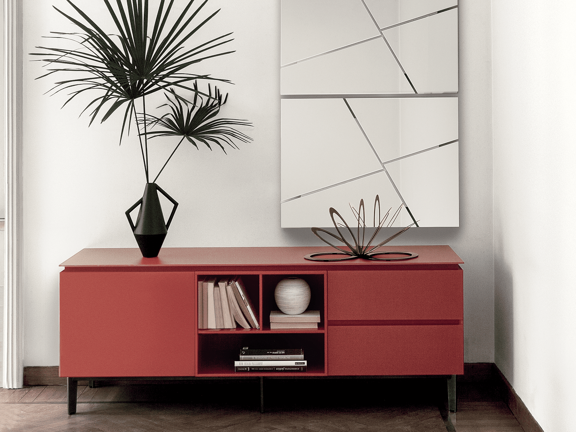 Wooden storage unit available with doors, drawers, baskets or open spaces. Groove opening system. Inside shelves in clear Glass. Top, frontal and side panels in Glossy glass and Velvet matt anti-scratch lacquered glass.