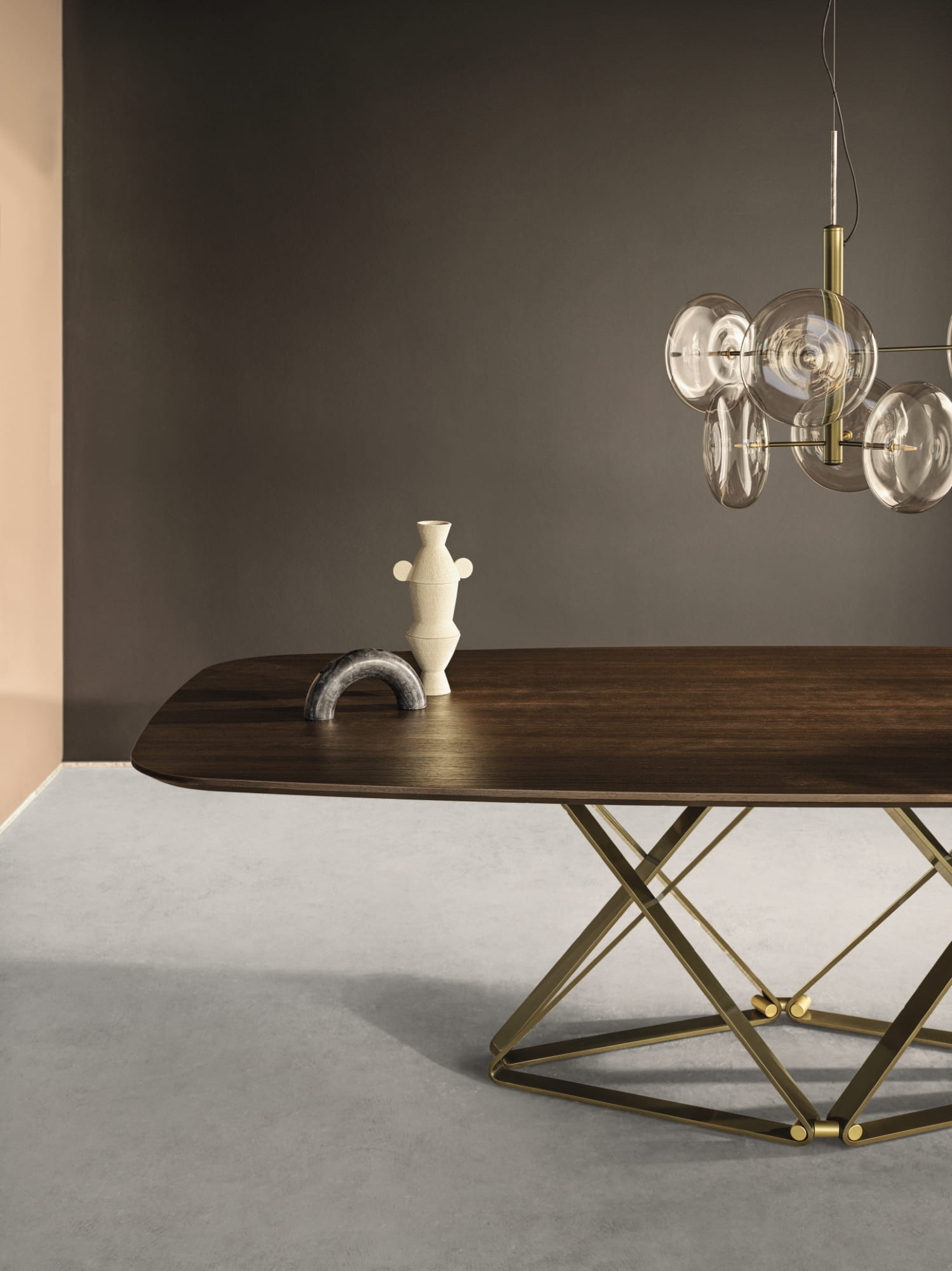 Fixed or extendible table with barrel shaped top or rectangular. Frame and decorative details in lacquered metal.