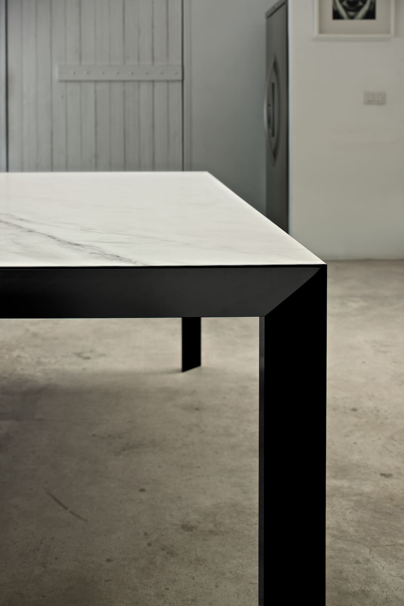 Table with extensions and lacquered Metal frame.Top in Glossy glass, Velvet matt anti-scratch lacquered glass,SuperCeramic or SuperMarble.