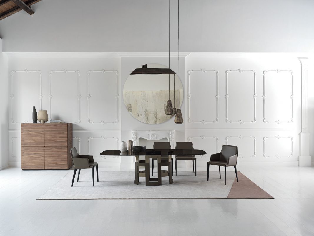 Table with elliptical, barrel shaped or rectangular top, fixed or with extentions, in Veneer wood, Veneer wood with solid edge, Solid wood with natural edge, Glossy glass, matt Velvet matt anti-scratch lacquered glass, SuperCeramic, SuperMarble or natural marble. Lacquered metal bracelet shaped frame.