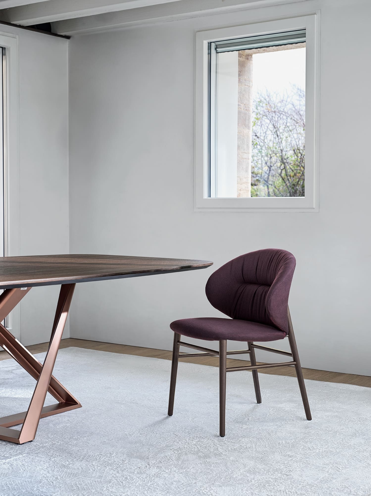 Table fix or with extensions, with lacquered Metal frame. Top in Solid wood, heritage walnut Solid wood, Veneer wood, Veneer wood with solid edge, lacquered Wood, Glossy glass, Velvet matt anti-scratch lacquered glass, Superceramic or SuperMarble.