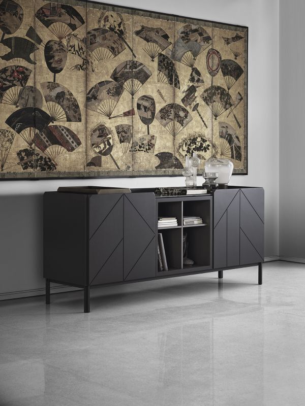 Wooden sideboards with hinged doors und open spaces, side panels and doors in lacquered decorated wood, top to choose. Base or frame with feet in lacquered metal.
