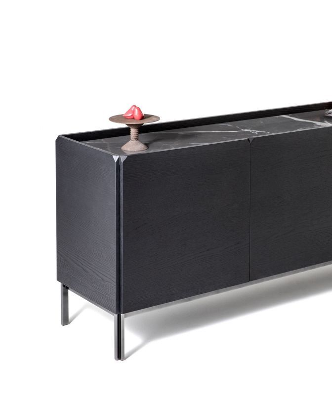 Wooden sideboards with hinged doors und open spaces, side panels and doors in lacquered decorated wood, top to choose. Base or frame with feet in lacquered metal.
