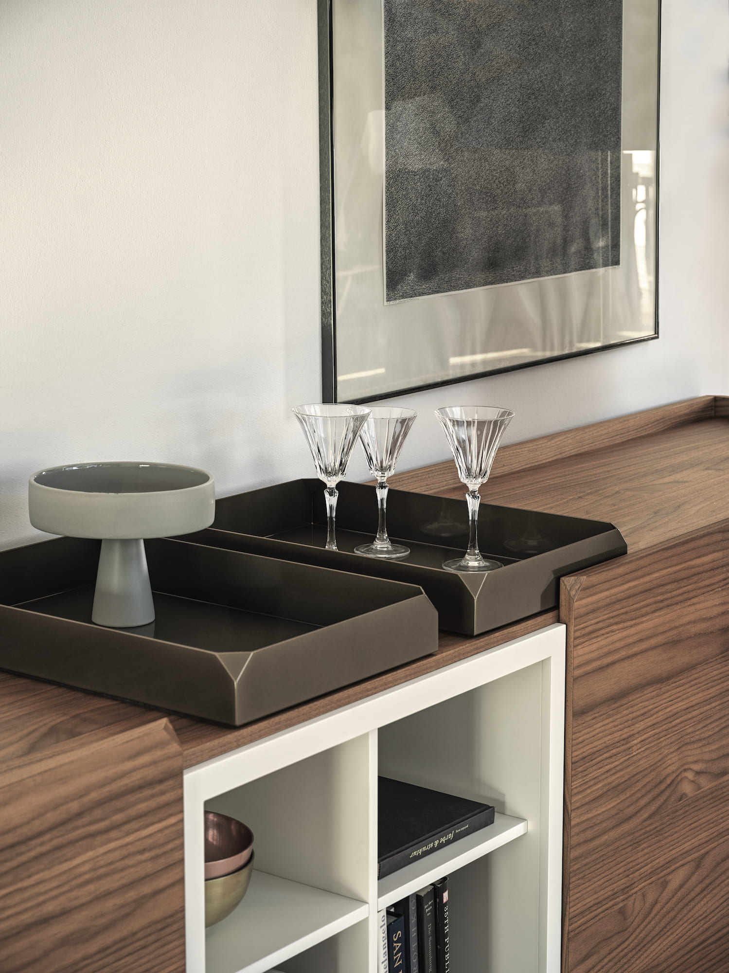 Wooden sideboards with hinged doors und open spaces, side panels and doors in lacquered decorated wood, top to choose. Base or frame with feet in lacquered metal.