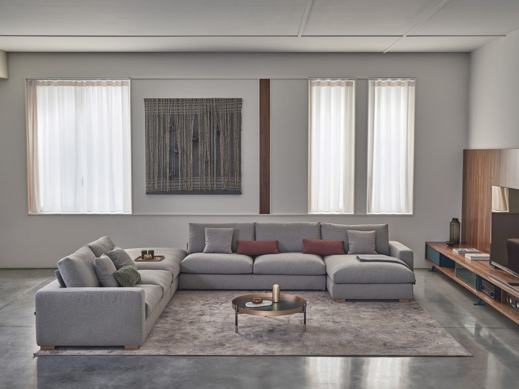 Contemporary and perfect for any furniture style. Excellent comfort thanks to the wide seat and the back cushions in goose down. The seats with or without backrests give movement to the composition. The SUNSET sofa can be enriched and customized with accessories such as decorative feet or armrest holder to create relax areas satisfying taste and functionality needs.