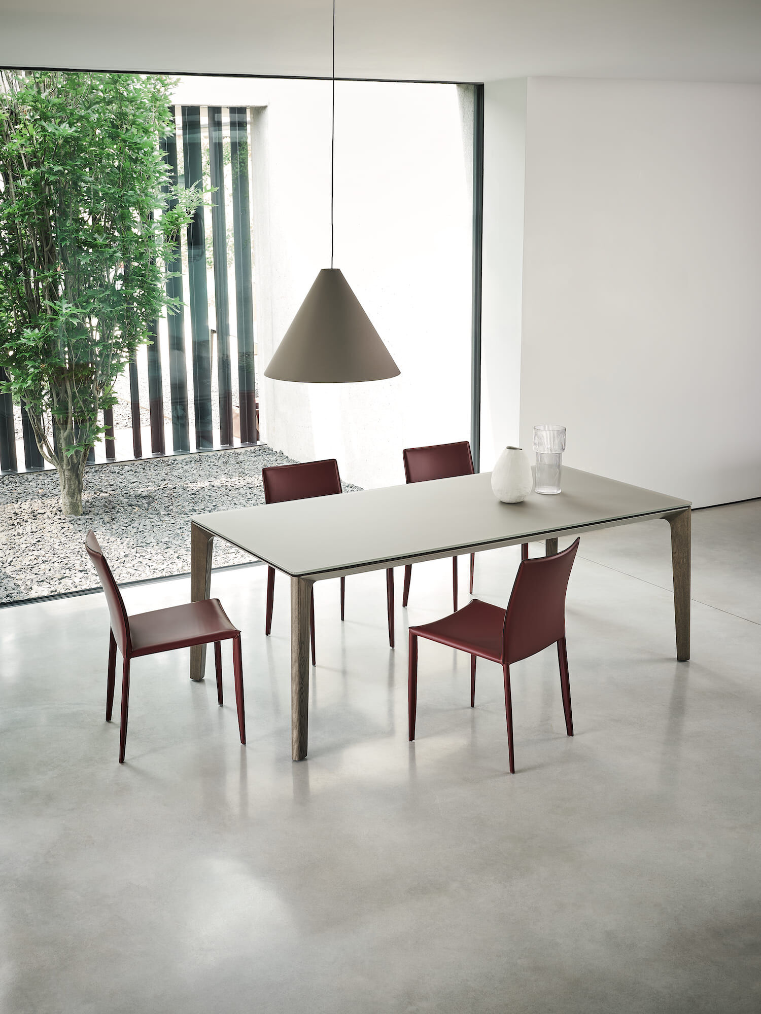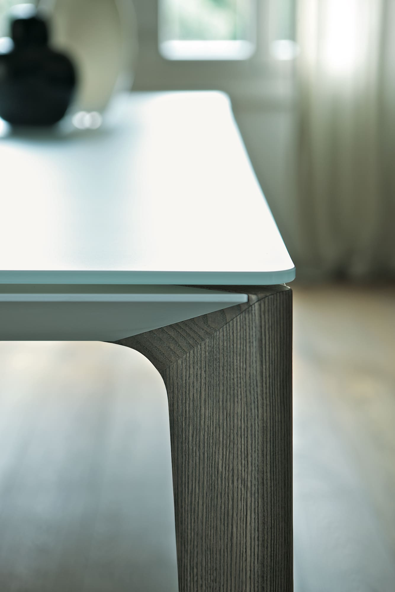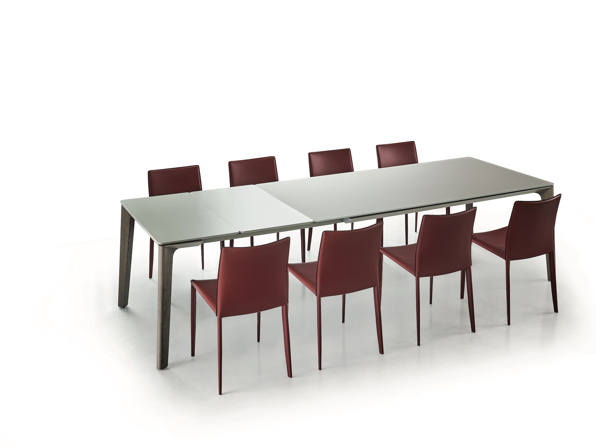 Table fix or with extensions with Metal frame in matching colours with top finishing, Solid wood legs. Top in Glossy glass, Velvet matt anti-scratch lacquered glass and SuperMarble.