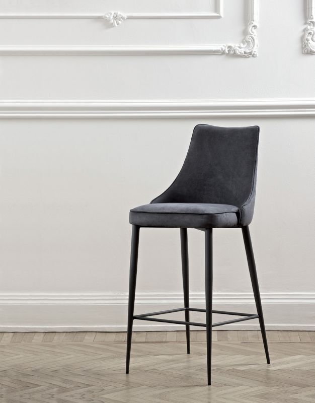 Taburete con estructura de acero, cuerpo totalmente acolchado y tapizado. Ribetes disponibles a juego o a contraste. También disponible en versión con respaldo acolchado (solo con tapizados de tejido Nordic, piel ecológica y piel premium).