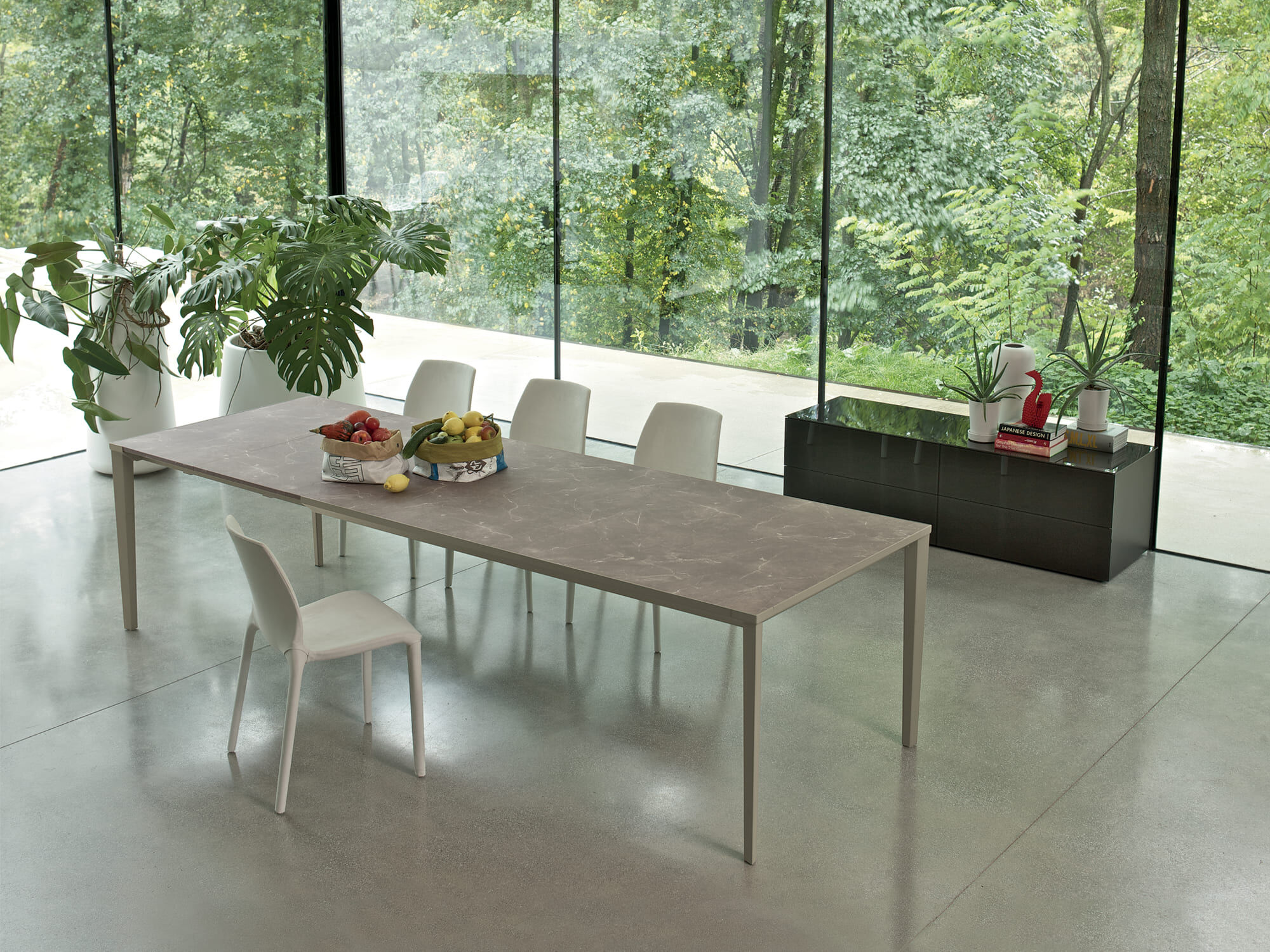 Mesa extensible con estructura de aluminio y acero, tablero de melamina, unicolor antiarañazos y contrachapado de madera.