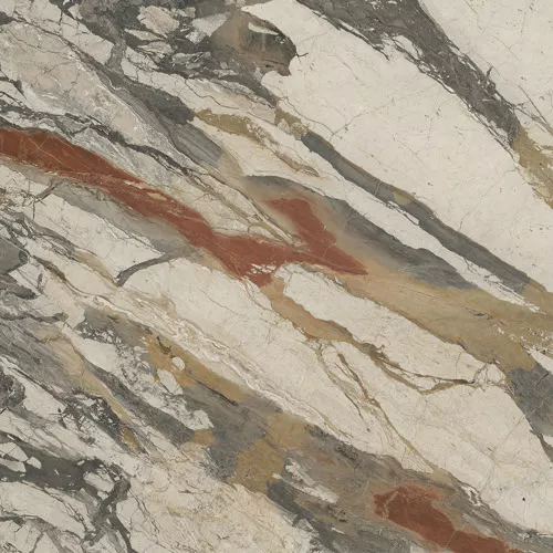 Mesa fija con estructura de aluminio lacado. Tablero de contrachapado de madera, madera símil maciza, madera maciza, madera maciza secular, supermármol arabescato y cristal.