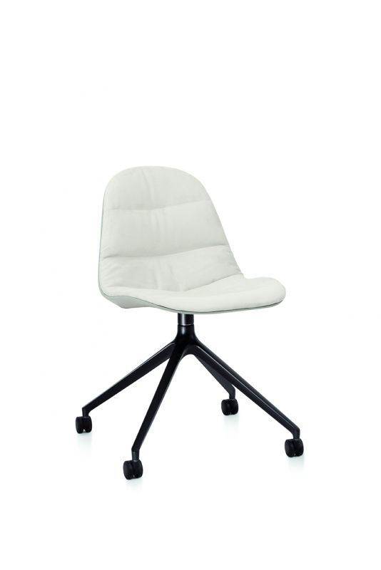 Taburete con estructura de acero lacado, patas de sección triangular y redonda. Cuerpo de polipropileno acolchado y tapizado en la parte delantera con piel ecológica premium, tejido Bouquet, tejido Nordic, lana virgen pura, terciopelo Supreme, tejido Kvadrat Field, tejido Kvadrat Coda y piel premium.