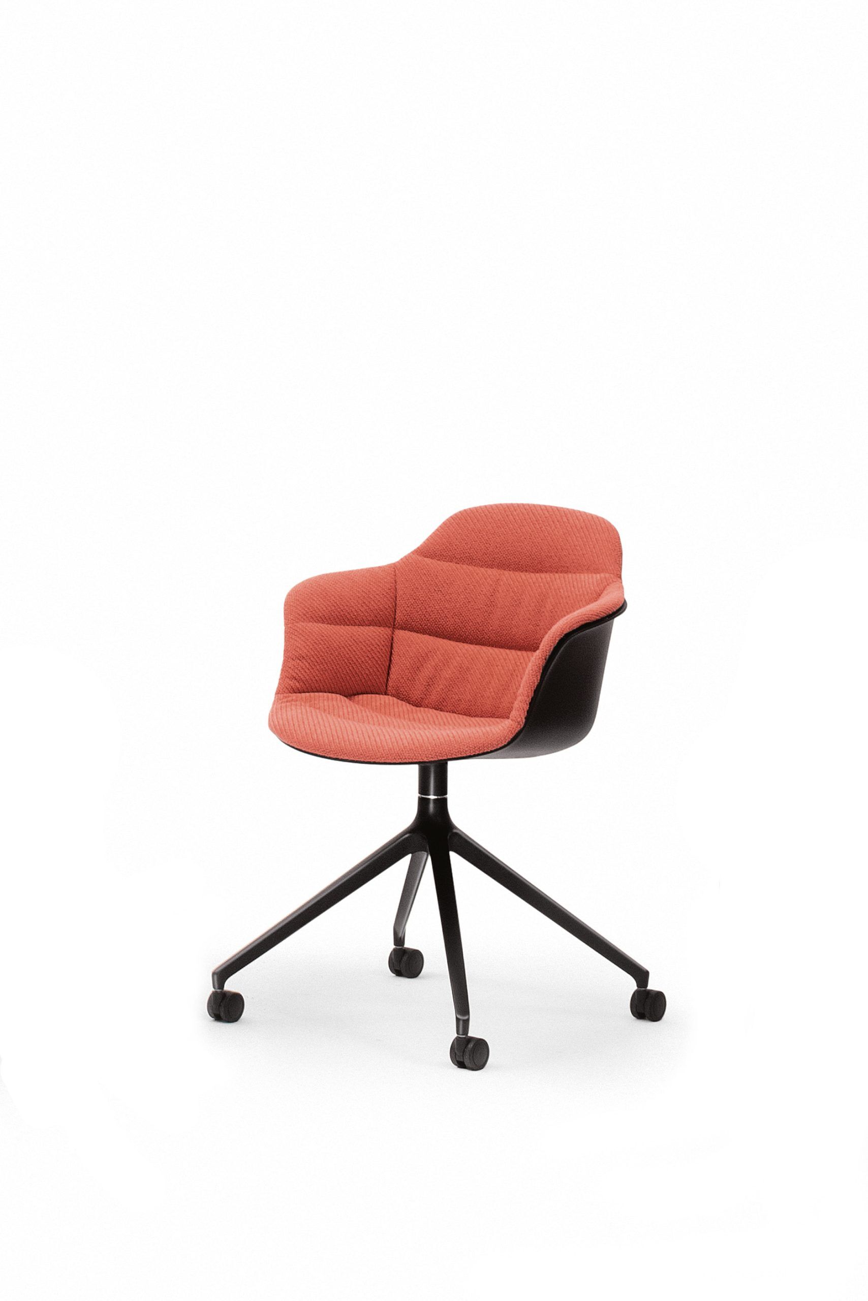 Taburete con estructura de acero lacado, patas de sección triangular y redonda. Cuerpo de polipropileno acolchado y tapizado en la parte delantera con piel ecológica premium, tejido Bouquet, tejido Nordic, lana virgen pura, terciopelo Supreme, tejido Kvadrat Field, tejido Kvadrat Coda y piel premium.
