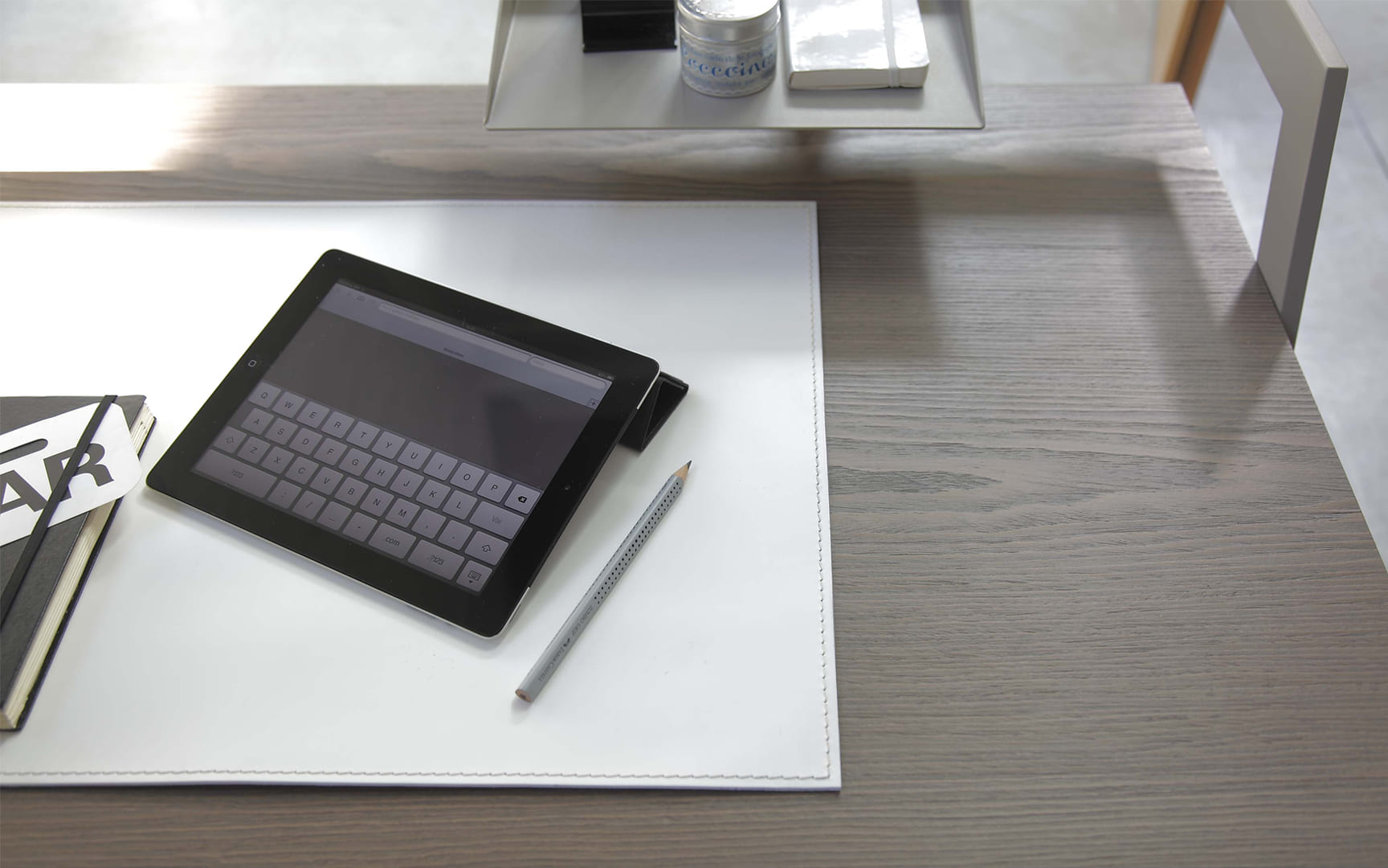 Escritorio con estructura y 2 bandejas de almacenaje de acero lacado, tablero y 2 cajones de madera.