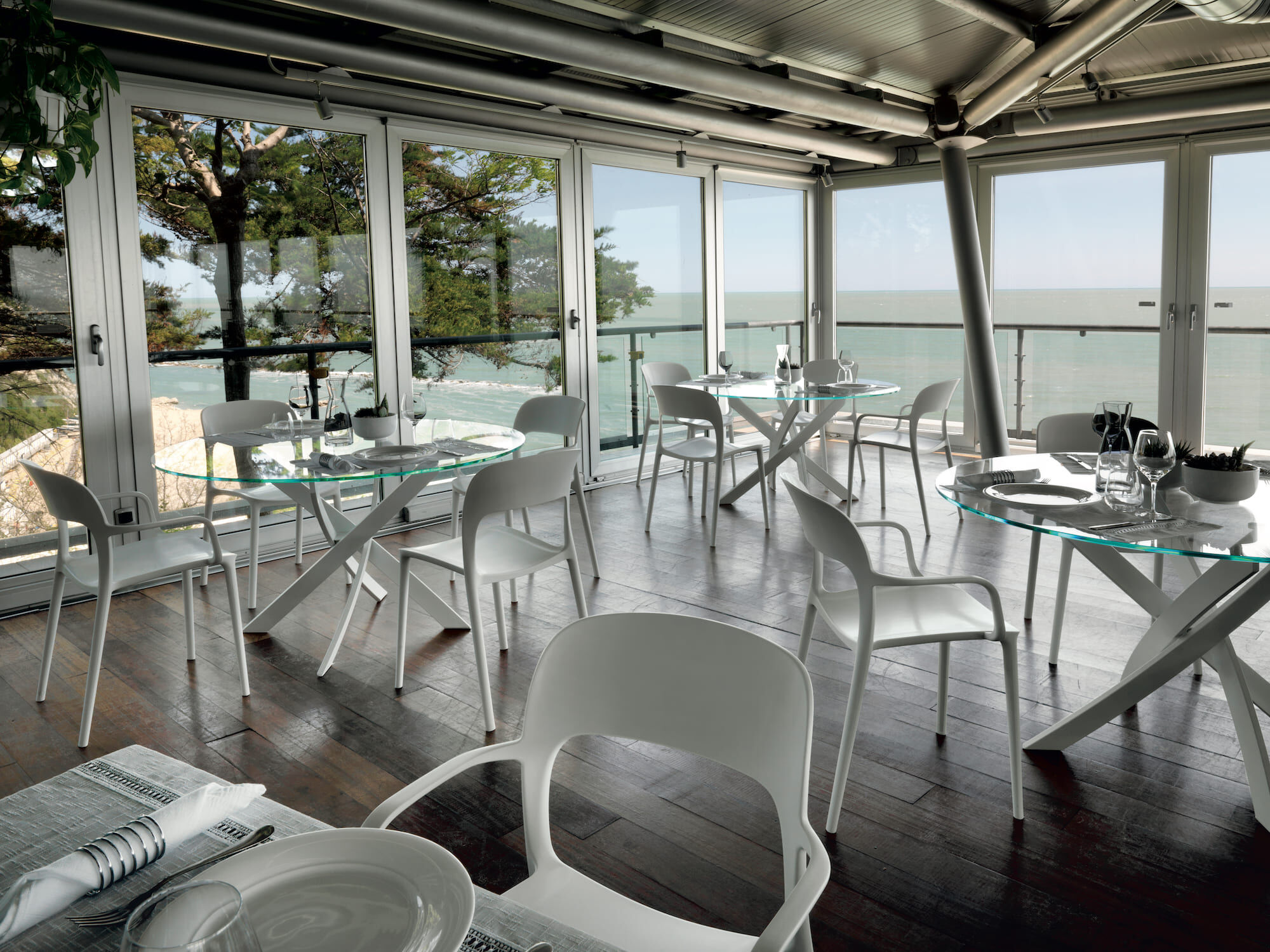 Table ronde ou elliptique, fixe ou avec allonges, structure en Métal laqué ou chromé. Plateau en Bois plaqué, Verre, Verre anti-rayure ou SuperMarbre et table ronde fixe, plateau pivotant central en Verre, Verre velvet anti-rayures opaque ou SuperMarbre avec plateau ring en bois plaqué.