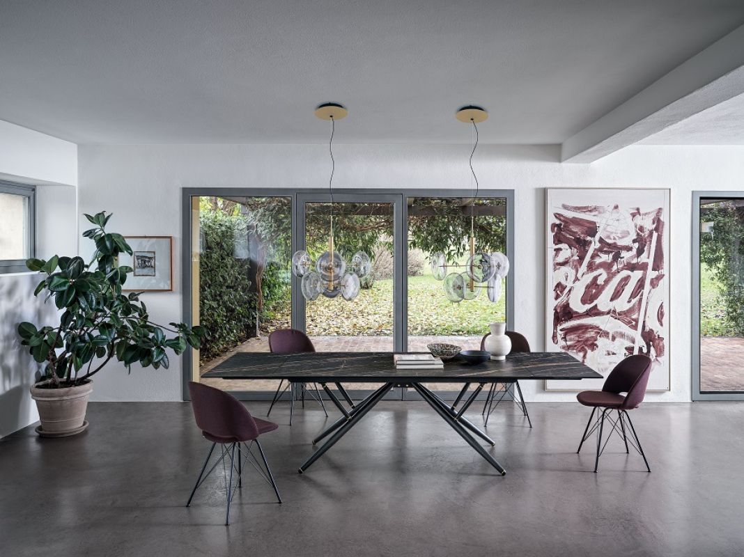 Table extensible ou fixe avec plateau ovale ou rectangulaire. Structure et détails décoratifs en Métal laqué. Plateau en Bois plaqué, plaqué avec bords en Bois massif, Bois massif, Verre, Verre velvet anti-rayures opaque, SuperCeramique et SuperMarbre.