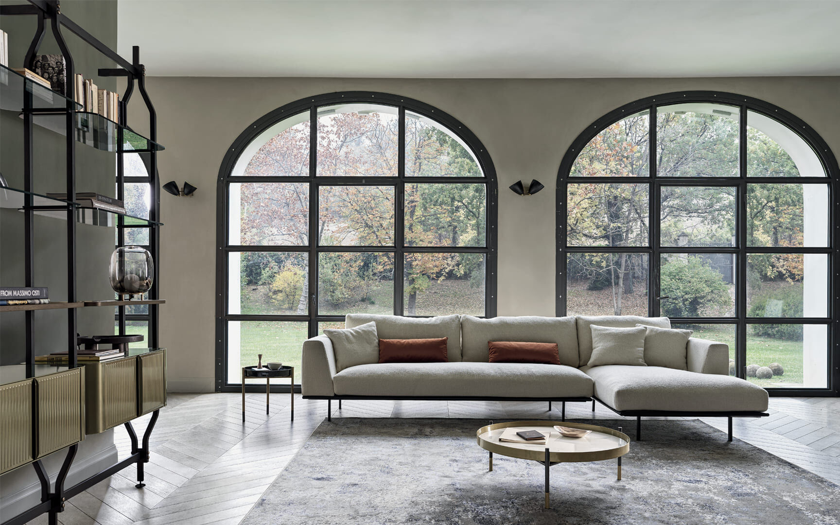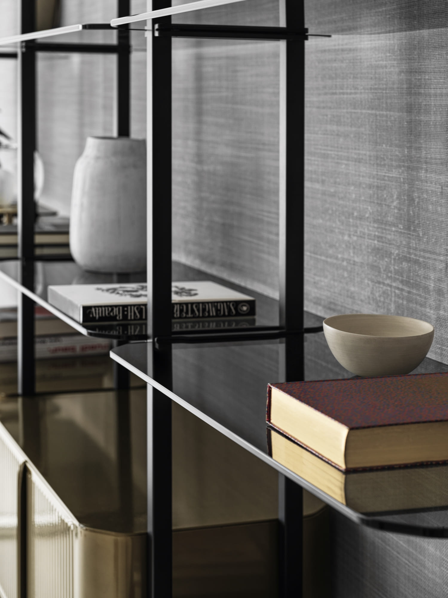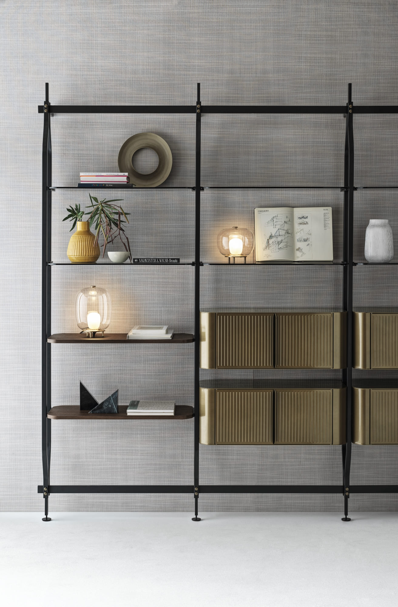 Bibliothèque avec fixation murale ou au plafond prévue pour l’insertion de max 4/8/12/16/20 étagères et/ou meubles contenitif optionnels. Structurée, traverses et détails decoratifs en métal laqué.
