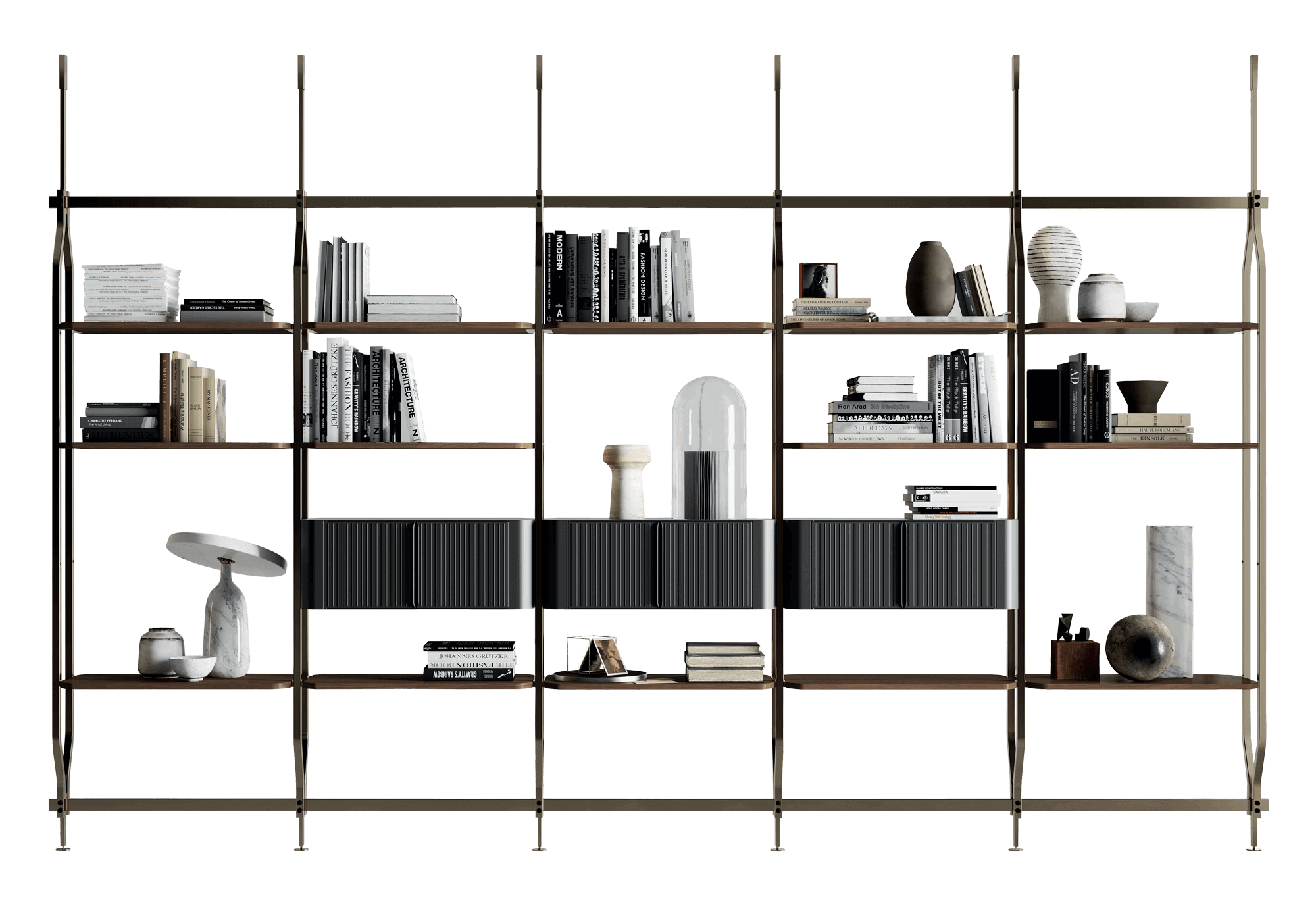 Bibliothèque avec fixation murale ou au plafond prévue pour l’insertion de max 4/8/12/16/20 étagères et/ou meubles contenitif optionnels. Structurée, traverses et détails decoratifs en métal laqué.