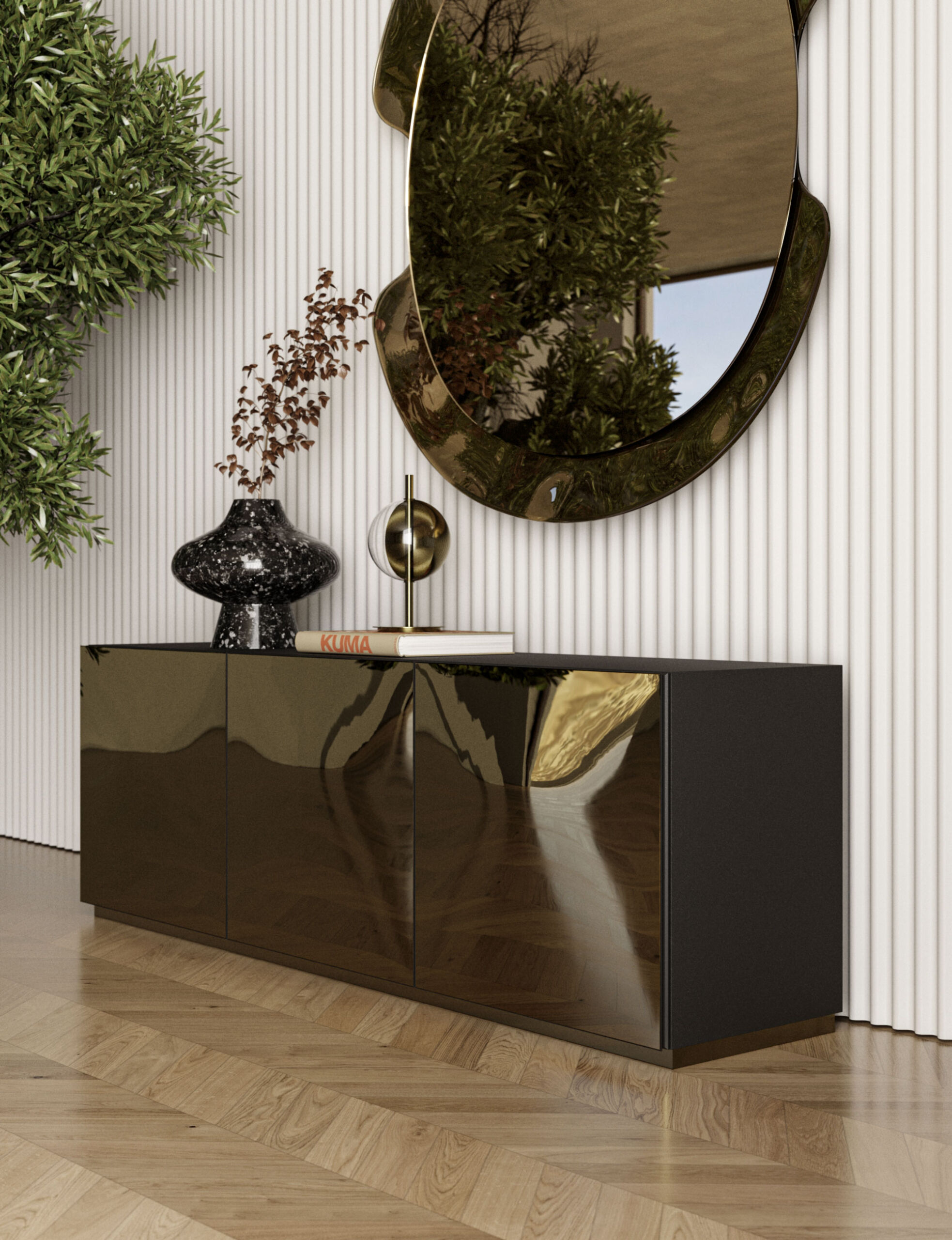 Bahut avec structure en bois composé par portes battantes, étagères intérieurs en verre transparent, flancs en bois plaqué et portes en Miroir bronze ou miroir fumé. A choisir avec socle ou pied en métal.
