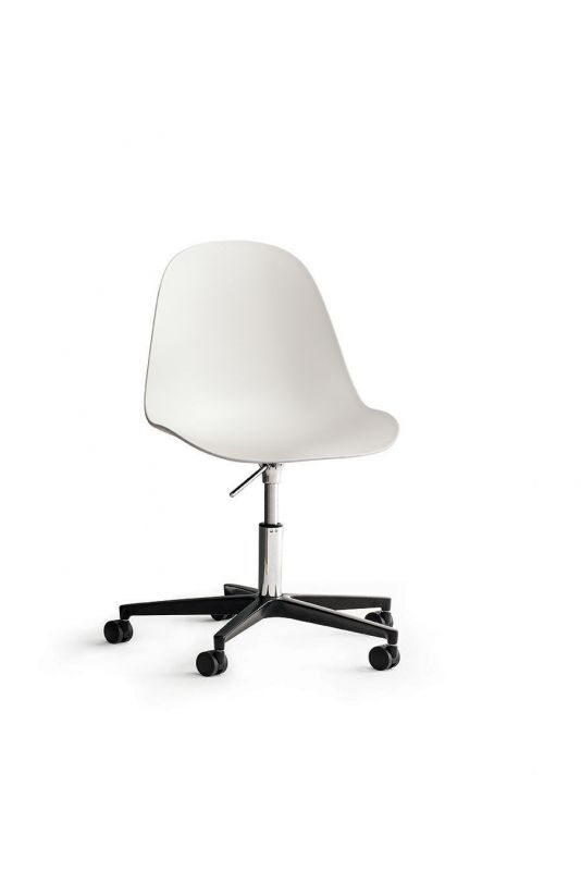 Chaise, chaise avec accoudoirs, pivotant ou avec roulettes, structure en Métal ou Bois, coque en Polypropylène.