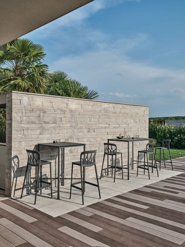 Table haute pour l'extérieur avec structure et détails décoratifs en Métal laqué. Plateau en Mélamine, Stratifié, Verre, Verre velvet anti-rayures, SuperCeramique and SuperMarbre.