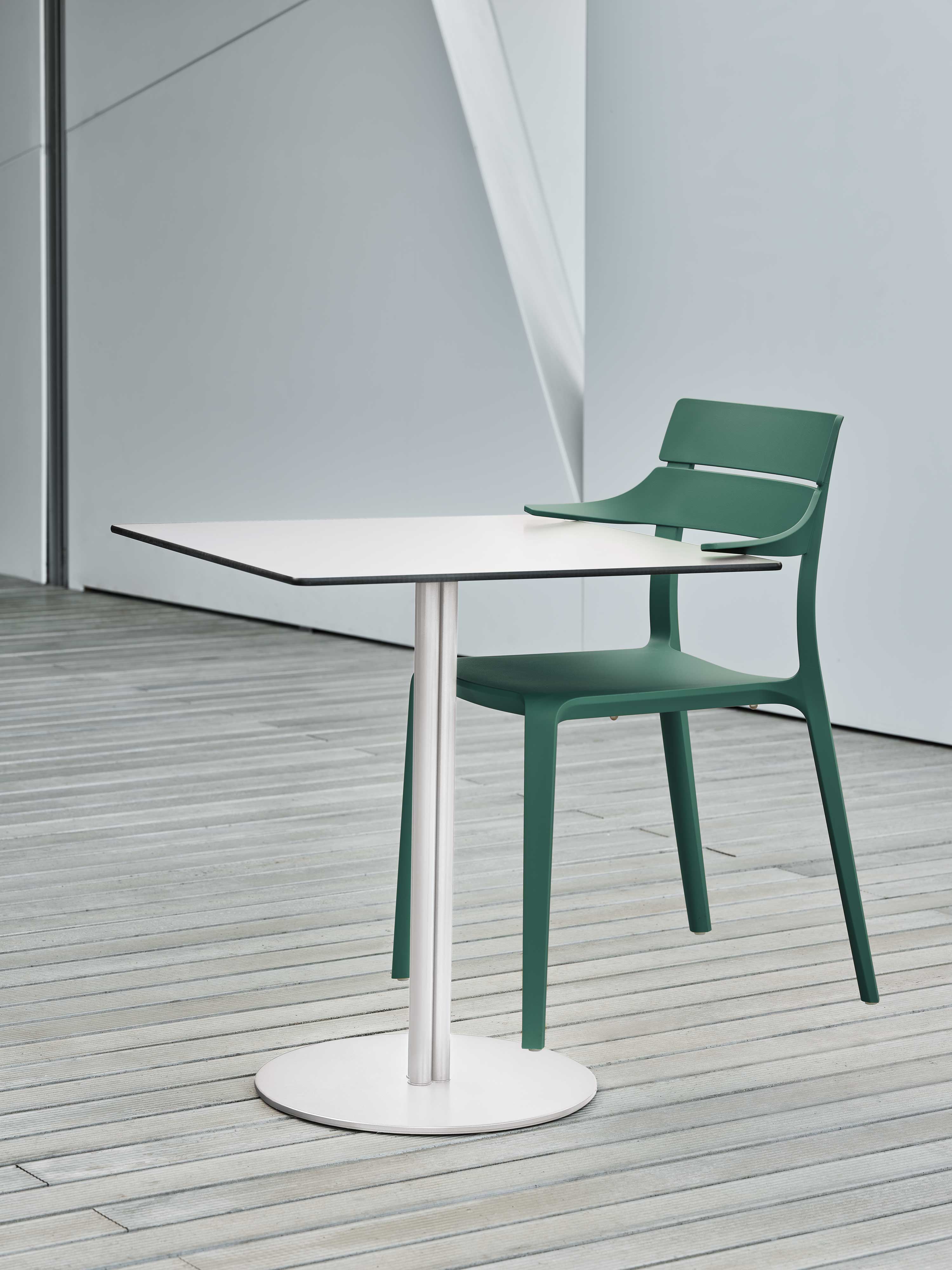 Chaise empilable avec structure intégrale en polypropylène et fibre de verre recyclé et recyclable.