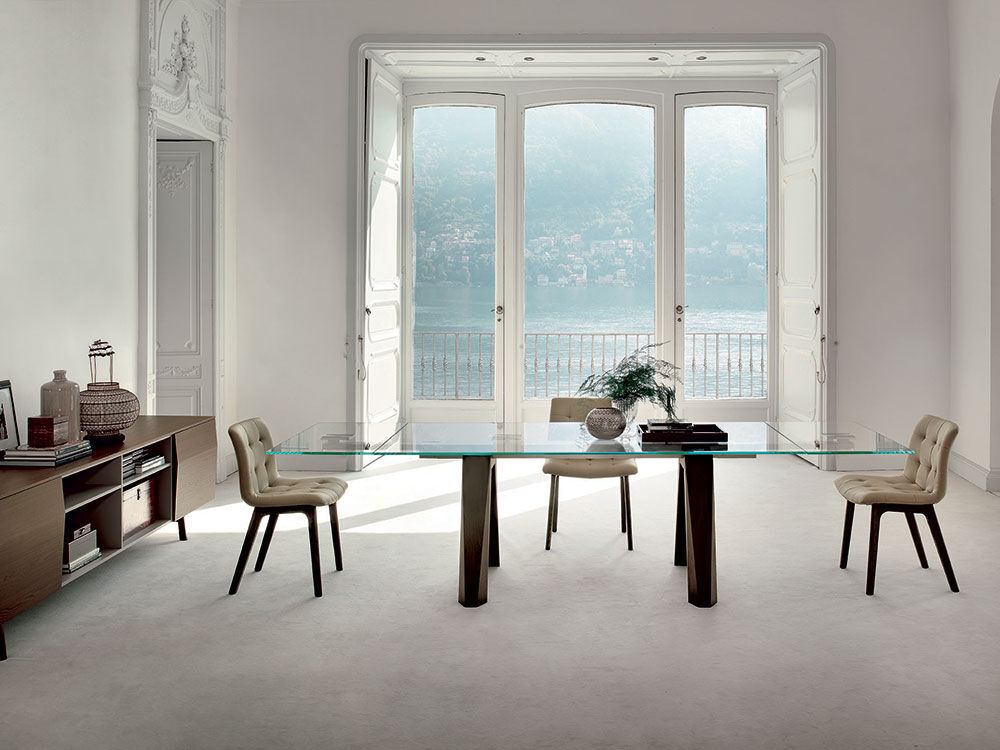 Un autre élément qui peut mettre en valeur le cristal est la structure de la table, en matériaux précieux ou avec la conception d’une véritable sculpture. Jouant avec la transparence et la légèreté du plateau, la structure est en fait mise au premier plan, c’est pourquoi de nombreuses tables extensibles avec pieds à la forme particulière et raffinée du catalogue Bontempi sont également disponibles avec un plateau en verre ou en verre résistant aux rayures.
