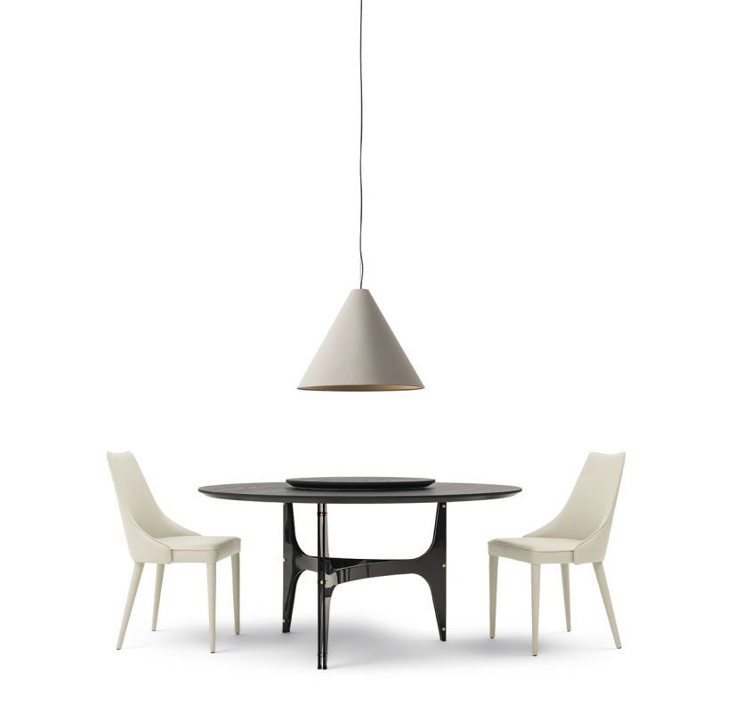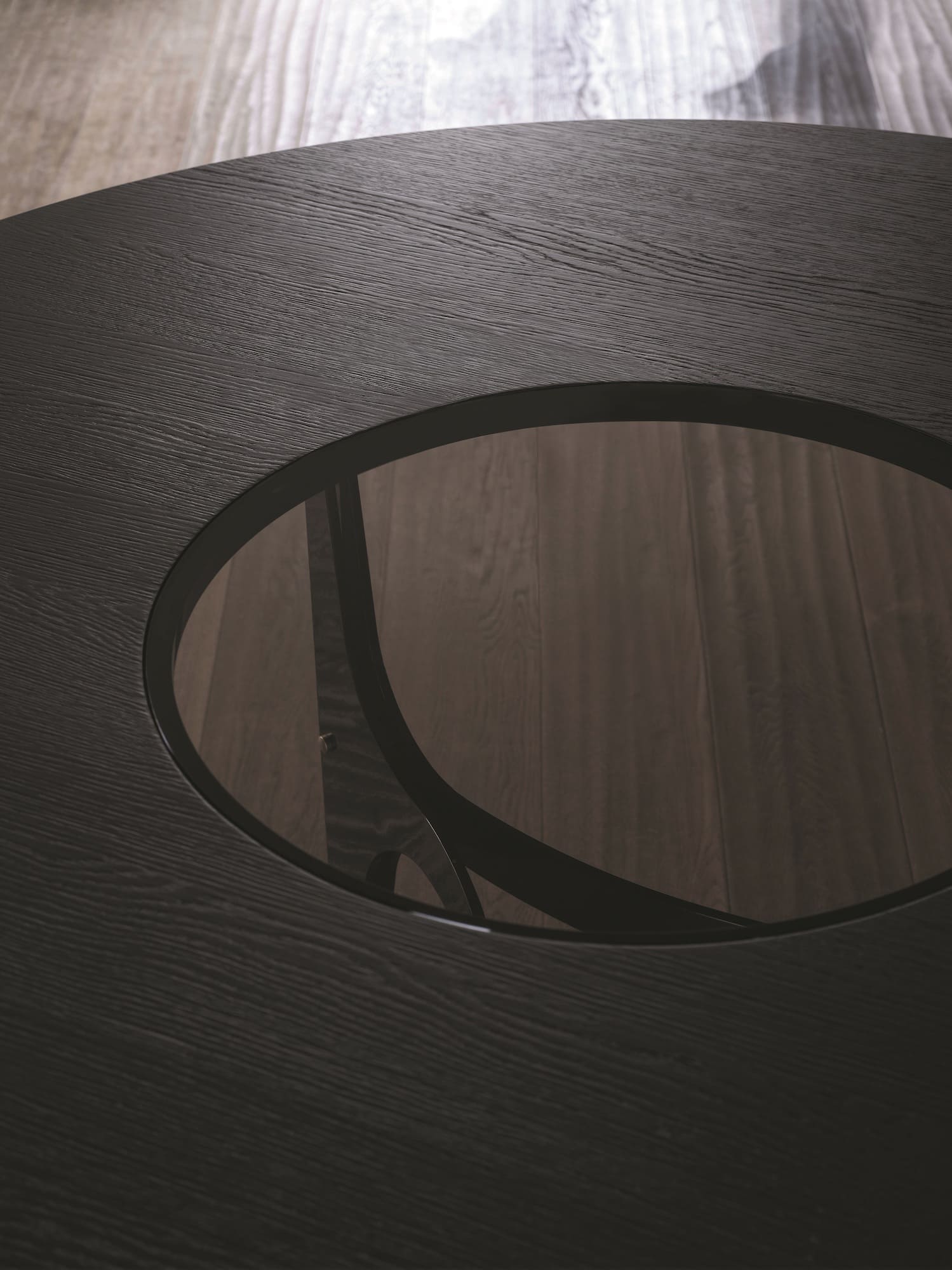 Table ronde fixe, structure et détails décoratifs en métal laqué, plateau standard en bois plaqué, verre brillant ou verre anti-rayures opaque ou plateau ring avec plateau pivotant central en verre brillant, verre anti-rayures opaque ou SuperMarbre.