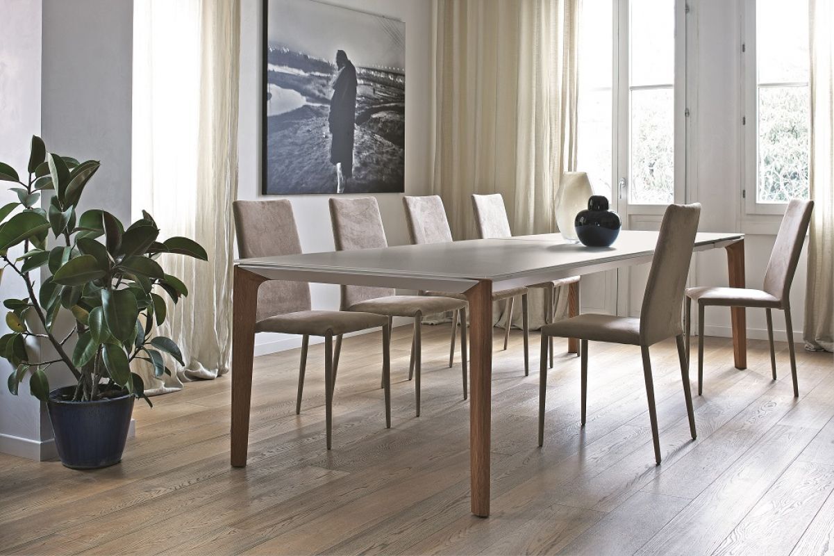 Table fixe ou avec allonges, structure en Aluminium laqué en teinte avec le plateau. Pieds en Bois massif. Plateau en Verre, Verre anti-rayure ou SuperMarbre.