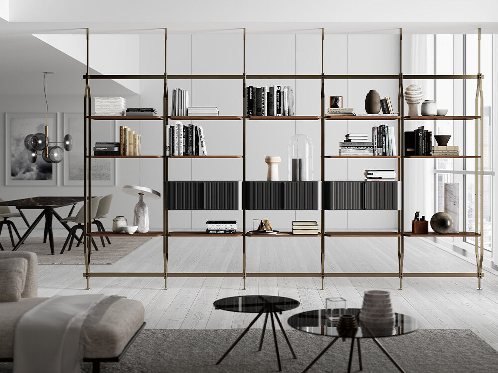 Dello stesso materiale, infatti, sono le librerie a parete Charlotte che sanciscono uno stile ben definito nell’arredo completo di questo ambiente.