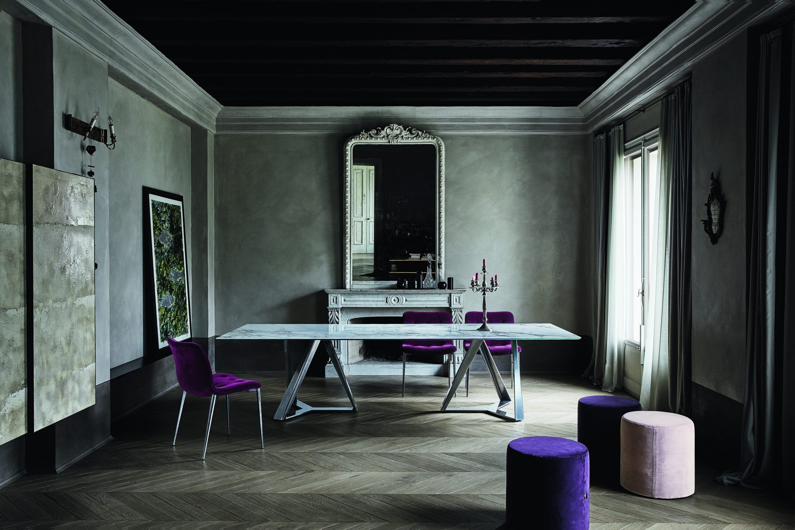 Il tavolo Versus in versione quadrata, disponibile per 8 o 12 posti, ha linee chic ed essenziali che mettono in risalto il pregio dei materiali con cui è realizzato. Il piano infatti può essere scelto in $1, un materiale esclusivo Bontempi che unisce il fascino del marmo a nuove caratteristiche funzionali, oppure in cristallo o cristallo antigraffio. Le gambe invece sono in legno massello, come quelle delle sedie imbottite Kelly abbinate.
