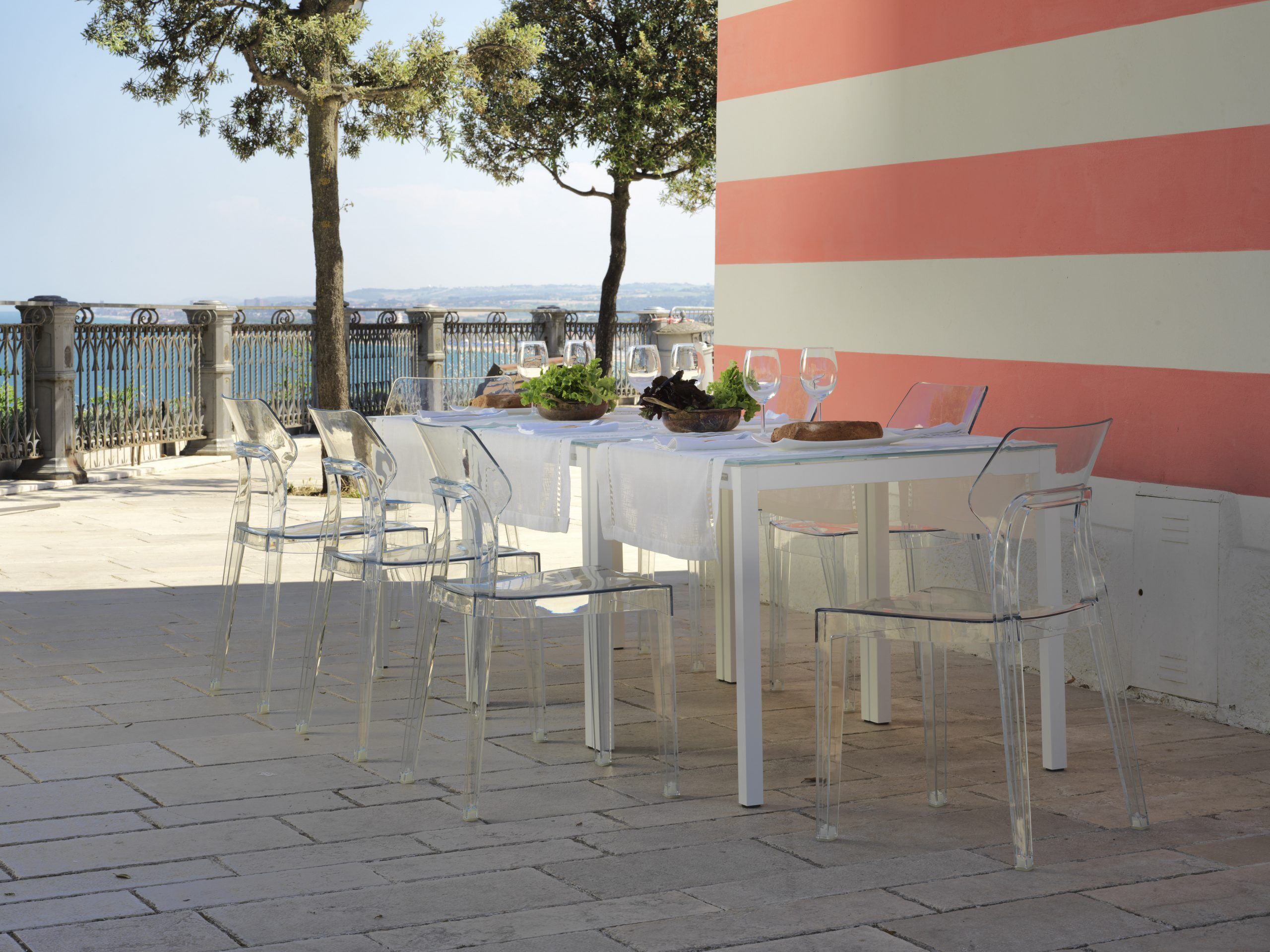 Tavolo Diesis, con struttura in acciaio laccato per outdoor e piano in cristallo e cristallo antigraffio; sedia Gipsy in policarbonato bianca, adatta anche per l’outdoor; e sgabello Boss in acciaio laccato bianco per outdoor.