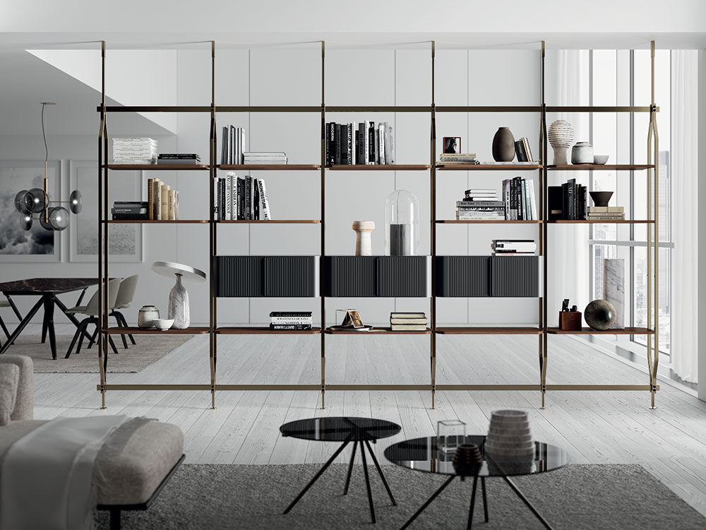 La soluzione ideale da utilizzare come parete per delimitare gli spazi nella zona giorno è la libreria Charlotte nella versione con fissaggio a soffitto. La sua struttura leggera e ariosa lascia circolare la luce attraverso gli spazi, e anche in questo caso è molto importante la disposizione di oggetti e contenitori per trovare il giusto equilibrio visivo.